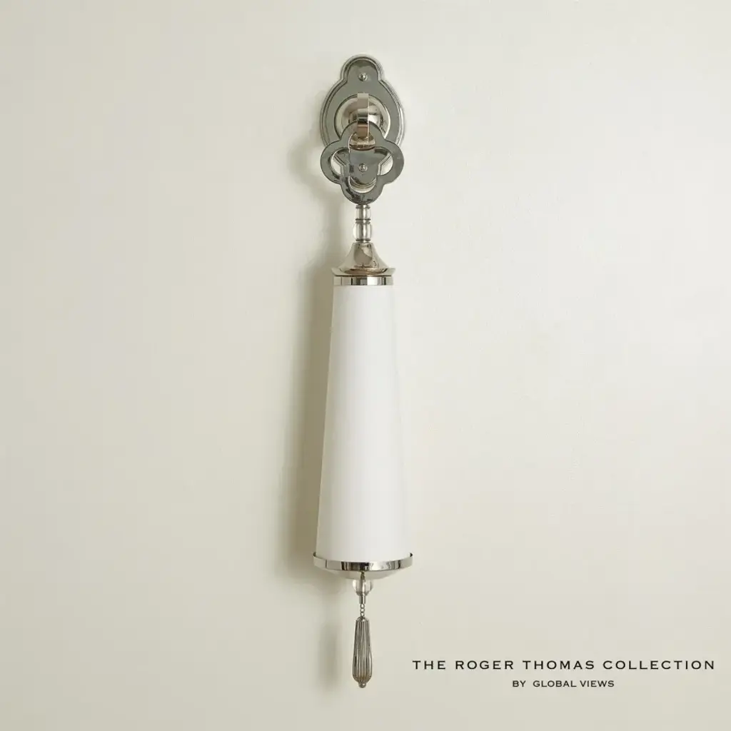Roger Thomas was inspired by chinoiserie, the most exotic influence of the 18th century decorative arts. Reinvent it's romance for the 21st century with our pendant sconce. Made of nickel plated solid brass with a quatrefoil design on the back plate. Crisp, pleated bottom finial. Hardback fabric shade. From a fashion forward perspective, Global Views offers accessories, furniture, statement lighting, and an assortment of rugs and mirrors to add beauty and joy to your home.