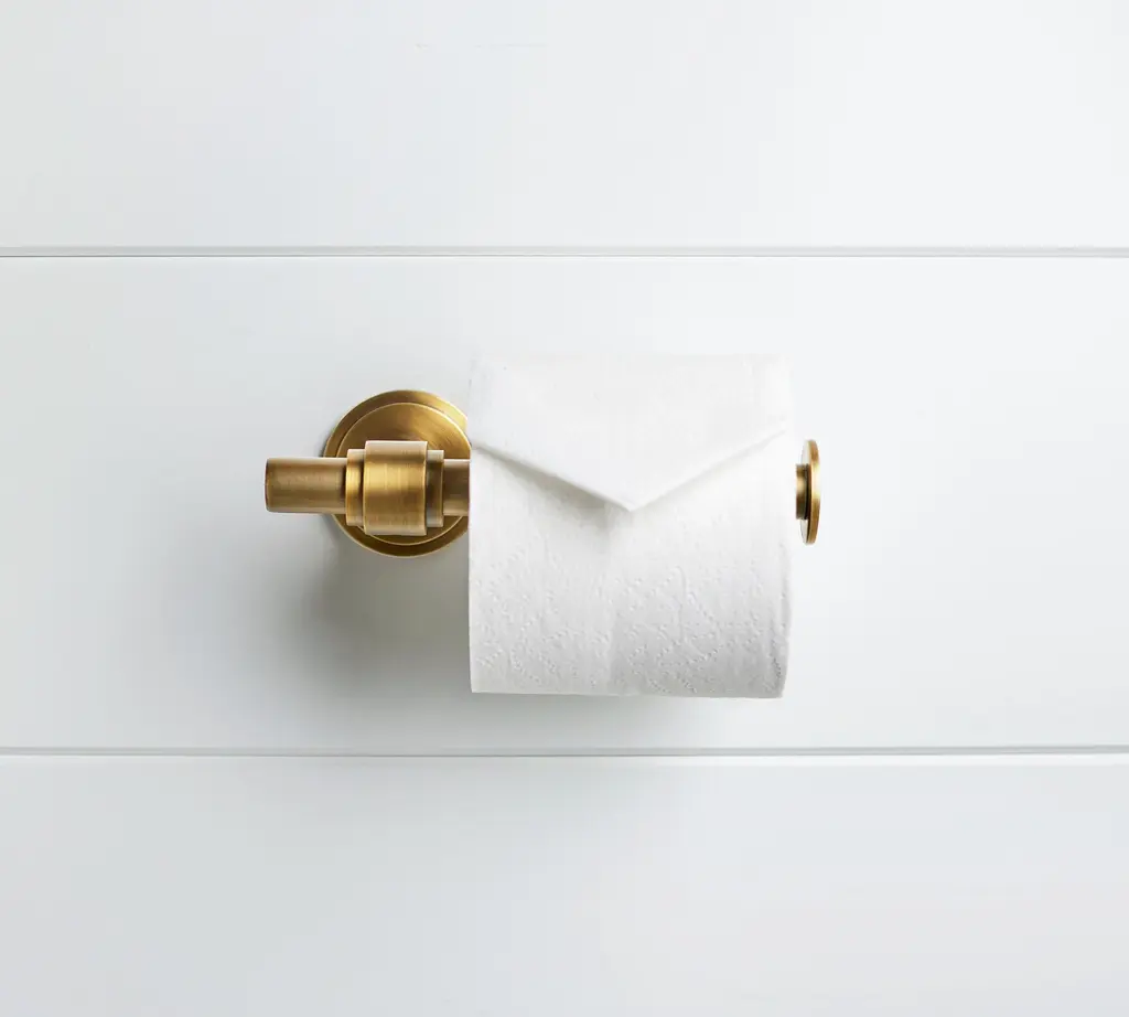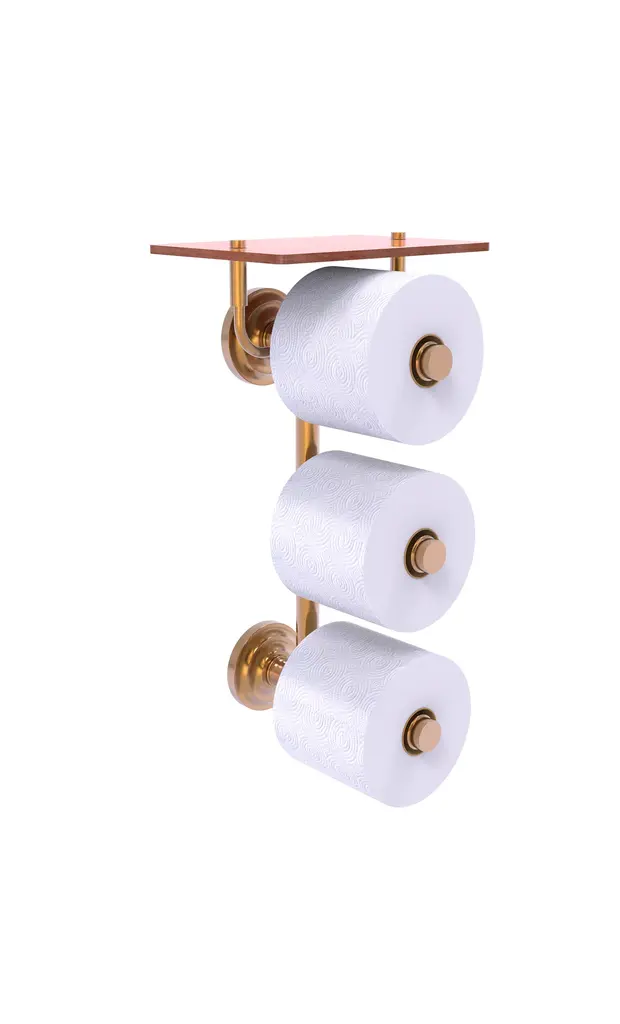 Make a beautiful design statement in your bathroom with this elegant and functional Que New Collection 3 Roll Toilet Paper Holder. Its a great way to always have a back up roll available. With a durable hardwood shelf on top to hold your phone or other on hand items, this vertical design is as functional as it is practical and sure to be a welcomed addition to any bathroom. It comes with all the hardware needed for easy wall mounted installation in the perfect spot. Made from all solid brass, this decorative accessory will provide a lifetime of practical use.Brushed Bronze, a satin-like texture, metallic dark golden finishCrafted from the finest solid brass materialsConcealed screw mounting hardware installs easilyDurable hardwood shelf for added convenienceGreat for having an extra roll at the readyContemporary design with traditional design elementsProvided with a Limited lifetime warranty