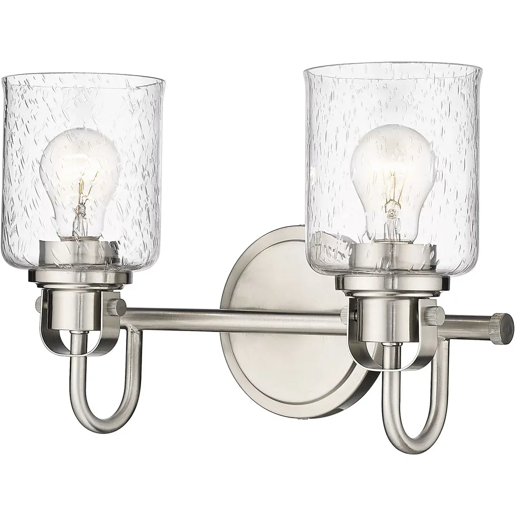Create a pleasant and well-lit bathroom area with the Acacia collection of bathroom wall lights from Quoizel. This two-light design comes in a shining brushed nickel finish, serving to enhance the brilliant illumination from the 100 watt bulbs. Two clear water glass shades allow light to spread unfiltered throughout your space. The Acacia collection can also be mounted with the lights facing up or down, making this a versatile piece that can also feel at home above a bathroom vanity.