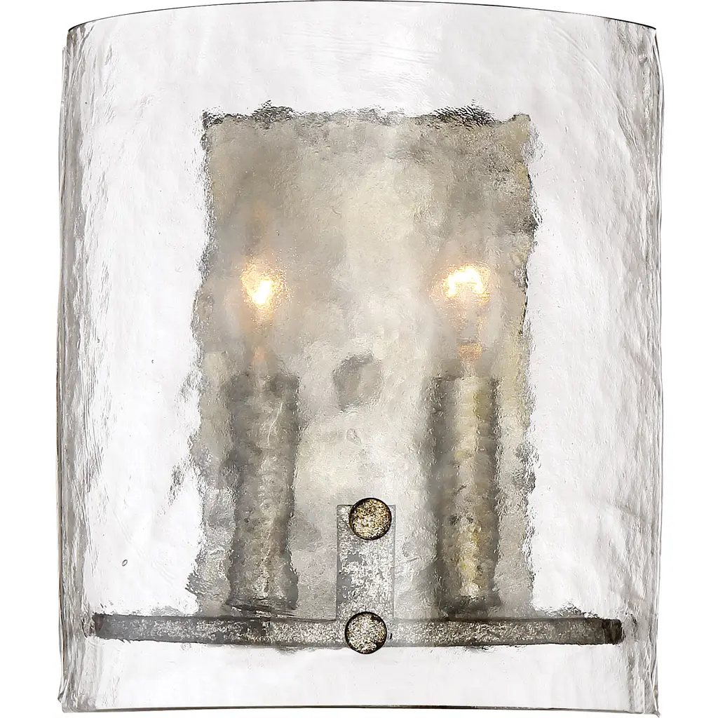 Two Light Wall Sconce from Fortress collection in Mottled Silver finish. Number of Bulbs 2. Max Wattage 60.00 . No bulbs included. A thoughtful use of materials and rustic styling give the Fortress an artisanal edge. Thick slabs of textured glass float around the mottled silver frame, secured with coordinating bolts. A hazy treatment of the glass is reminiscent of days gone by. No UL Availability at this time.