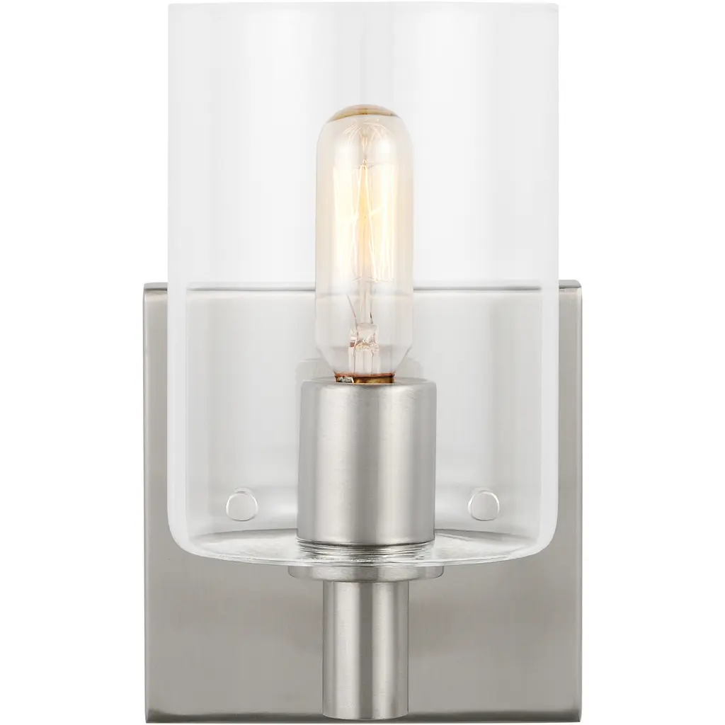 Material: Glass, Finish Color: Satin Nickel, Width: 4.75", Height: 9.25", Depth: 6", Number Of Bulbs: 1, Wattage: 100 Watts, Dimmable: No, Moisture Rating: Damp Rated, Desc: Add a sleek luminary to your washroom ensemble. This classic vanity light design includes a few updated features. A Satin Nickel finish and clear seeded glass shades give this luminary a modern appeal, with a touch of elegance. The back plate sports the same classic finish with dual layer mount. Fit for 100W medium base bulbs for an ambient glow. Give your bathroom mirror a fresh new look with this one-light wall mount. Shade Included: Yes. ,