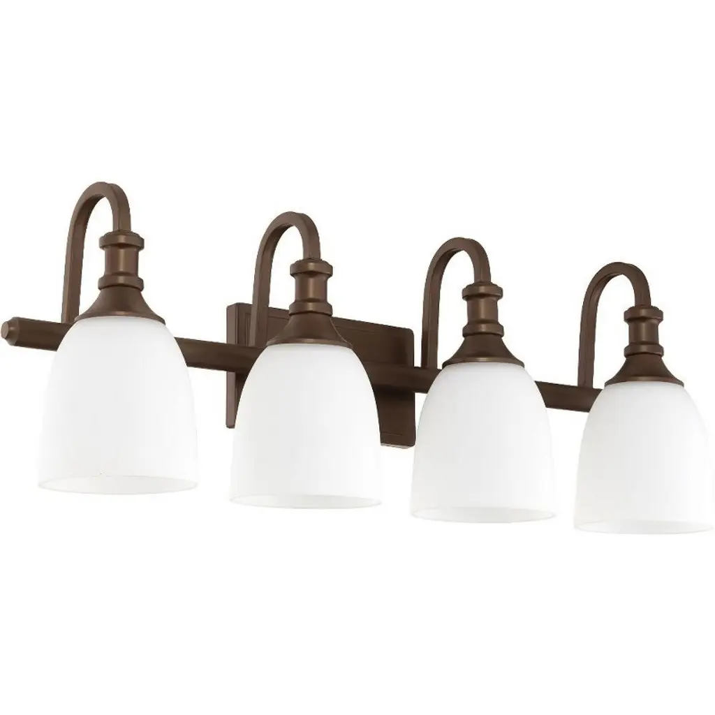 Material: Glass, Finish Color: Old World, Width: 36", Height: 8", Depth: 7.75", Number Of Bulbs: 5, Wattage: 100 Watts, Dimmable: No, Moisture Rating: Damp Rated, Desc: This classic vanity light design includes a few updated features. A Satin Nickel finish and clear seeded bell-shaped glass shades give this washroom luminary a modern appeal. The back plate sports the same classic design with decorative fastening knobs. Give your bathroom mirror a fresh new look with this five-light vanity. Shade Included: Yes. ,