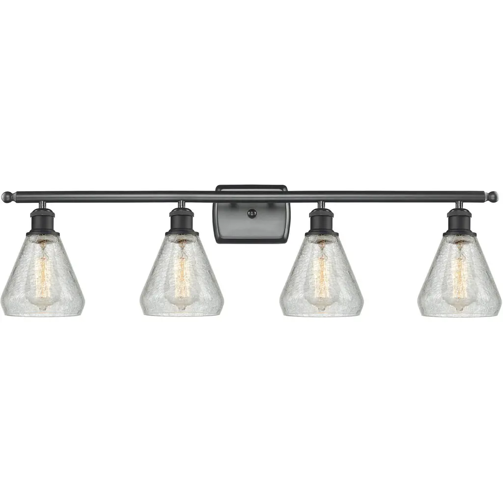 Material: Glass, Finish Color: Noir, Width: 48", Height: 8", Depth: 7.75", Number Of Bulbs: 6, Wattage: 100 Watts, Dimmable: No, Moisture Rating: Damp Rated, Desc: This classic vanity light design includes a few updated features. A Satin Nickel finish and clear seeded bell-shaped glass shades give this washroom luminary a modern appeal. The back plate sports the same classic design with decorative fastening knobs. Give your bathroom mirror a fresh new look with this Six-light vanity. Shade Included: Yes. ,
