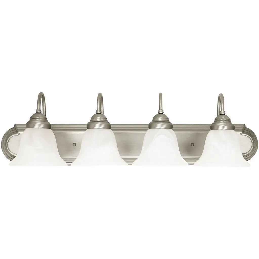 Material: Glass, Finish Color: Satin Nickel, Width: 48", Height: 8", Depth: 7.75", Number Of Bulbs: 6, Wattage: 100 Watts, Dimmable: No, Moisture Rating: Damp Rated, Desc: This classic vanity light design includes a few updated features. A Satin Nickel finish and clear seeded bell-shaped glass shades give this washroom luminary a modern appeal. The back plate sports the same classic design with decorative fastening knobs. Give your bathroom mirror a fresh new look with this Six-light vanity. Shade Included: Yes. ,