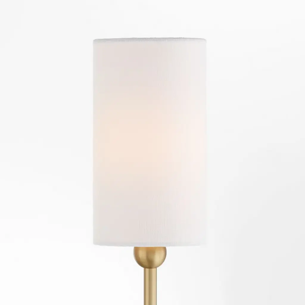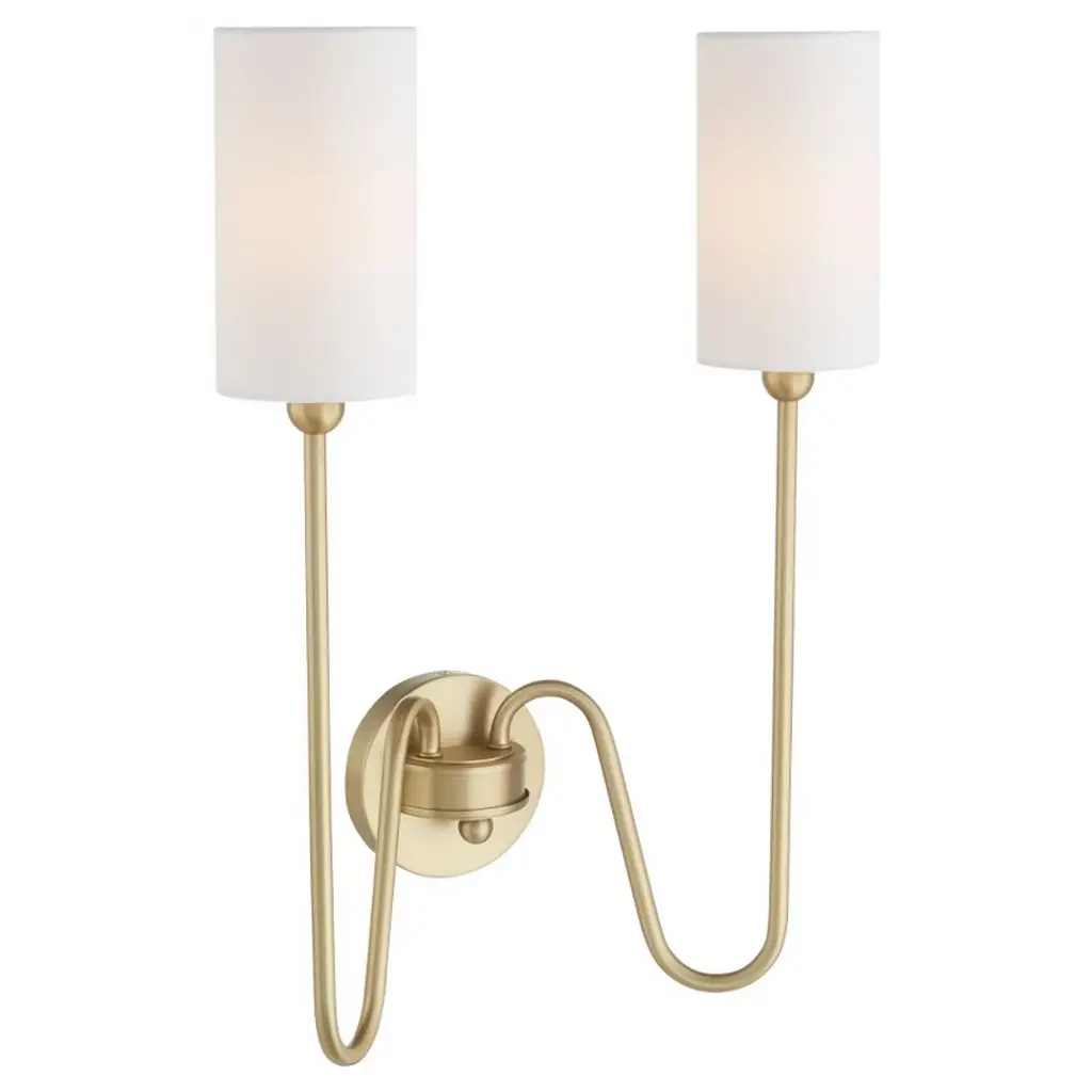 Collection: Charlotte, Material: Fabric, Finish Color: Aged Brass, Width: 15.75", Height: 21.5", Depth: 6.75", Height From Outlet Box: 16.5", Backplate Width: 4.75", Lamping Type: Incandescent, Number Of Bulbs: 2, Wattage: 100 Watts, Moisture Rating: Damp Rated, Desc: Tamara Day�s signature style, �laid back luxe,� comes to life in the Charlotte series of chandeliers, wall mounts, and vanity lights inspired by three homes on Charlotte Street. Tamara�s trademark approach to design manifests in timeless silhouettes of a classically shaped frame modernized with subtle curves echoed by spherical details. Instinctive movement is exhibited by arms that round corners to connecting effortlessly to round backplates. Candelabra sockets are concealed by clear glass cylindrical shades that parallel enduring finishes of matte black or aged brass. The Charlotte wall mount comes in three options of 1, 2 or 3 light arrangements.,