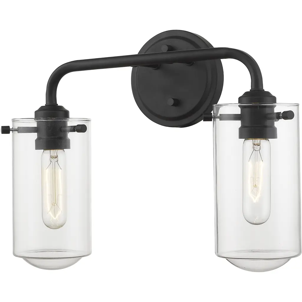 Collection: Charlotte, Material: Glass, Finish Color: Matte Black, Width: 13.75", Height: 12.75", Depth: 5.5", Height From Outlet Box: 10.88", Backplate Width: 5.25", Lamping Type: Incandescent, Number Of Bulbs: 2, Wattage: 100 Watts, Moisture Rating: Damp Rated, Desc: Tamara Day�s signature style, �laid back luxe,� comes to life in the Charlotte series of chandeliers, wall mounts, and vanity lights inspired by three homes on Charlotte Street. Tamara�s trademark approach to design manifests in timeless silhouettes of a classically shaped frame modernized with subtle curves echoed by spherical details. Instinctive movement is exhibited by arms that round corners to connecting effortlessly to round backplates. Candelabra sockets are concealed by clear glass cylindrical shades that parallel enduring finishes of matte black or aged brass. The Charlotte vanity comes in three options of 2, 3 or 4 light arrangements.,