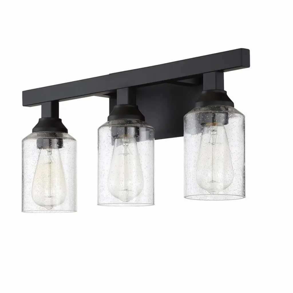 Collection: Charlotte, Material: Glass, Finish Color: Matte Black, Width: 23.5", Height: 12.75", Depth: 5.5", Height From Outlet Box: 10.88", Backplate Width: 5.25", Lamping Type: Incandescent, Number Of Bulbs: 3, Wattage: 100 Watts, Moisture Rating: Damp Rated, Desc: Tamara Day�s signature style, �laid back luxe,� comes to life in the Charlotte series of chandeliers, wall mounts, and vanity lights inspired by three homes on Charlotte Street. Tamara�s trademark approach to design manifests in timeless silhouettes of a classically shaped frame modernized with subtle curves echoed by spherical details. Instinctive movement is exhibited by arms that round corners to connecting effortlessly to round backplates. Candelabra sockets are concealed by clear glass cylindrical shades that parallel enduring finishes of matte black or aged brass. The Charlotte vanity comes in three options of 2, 3 or 4 light arrangements.,