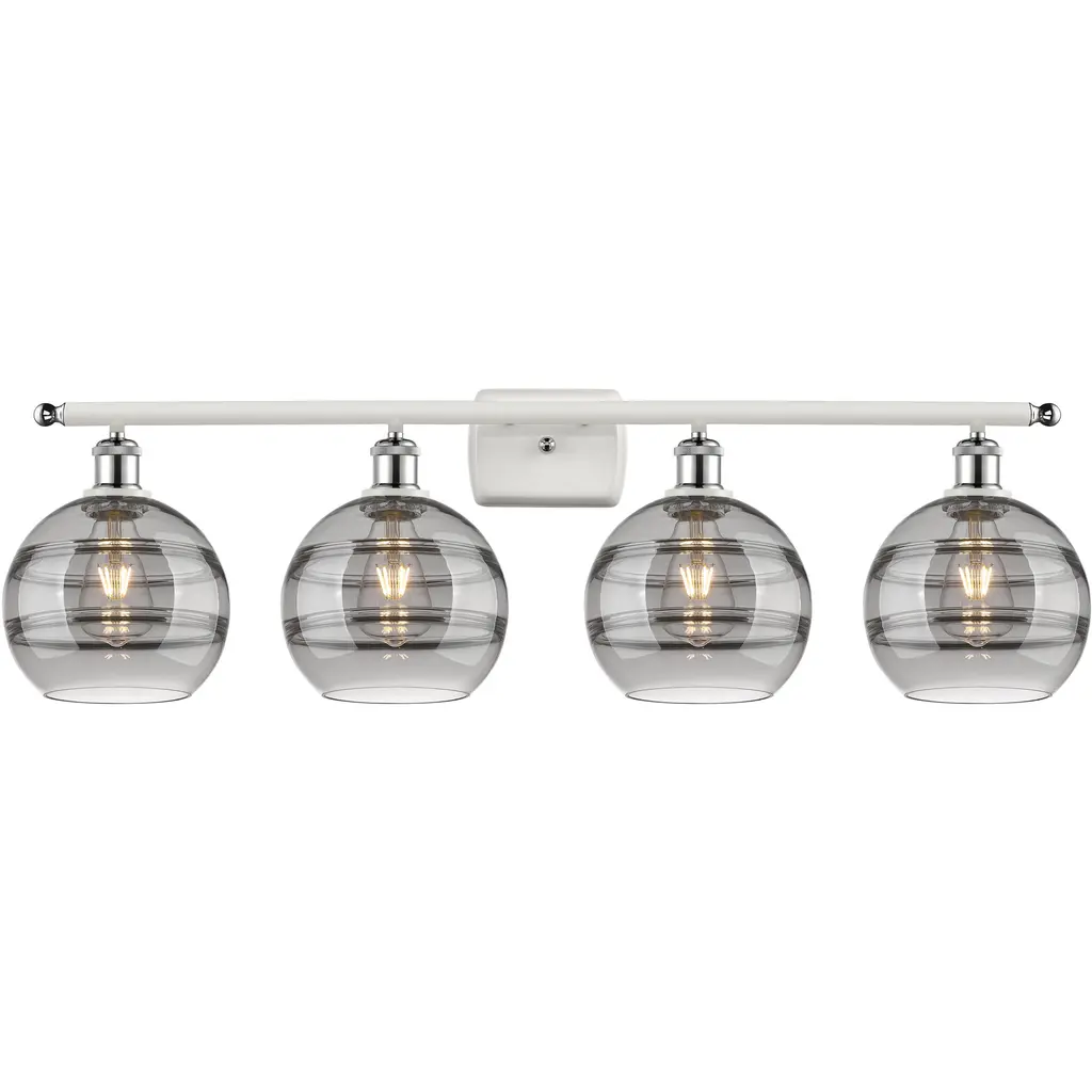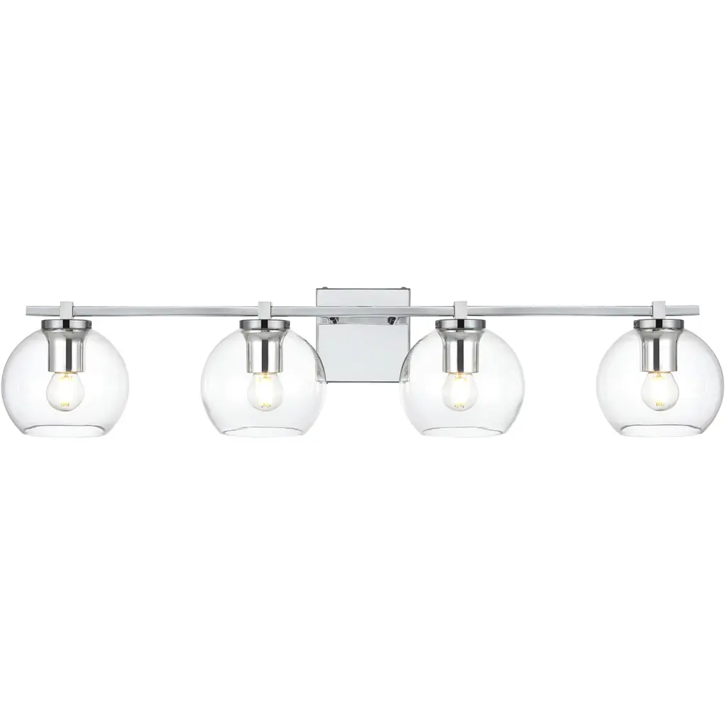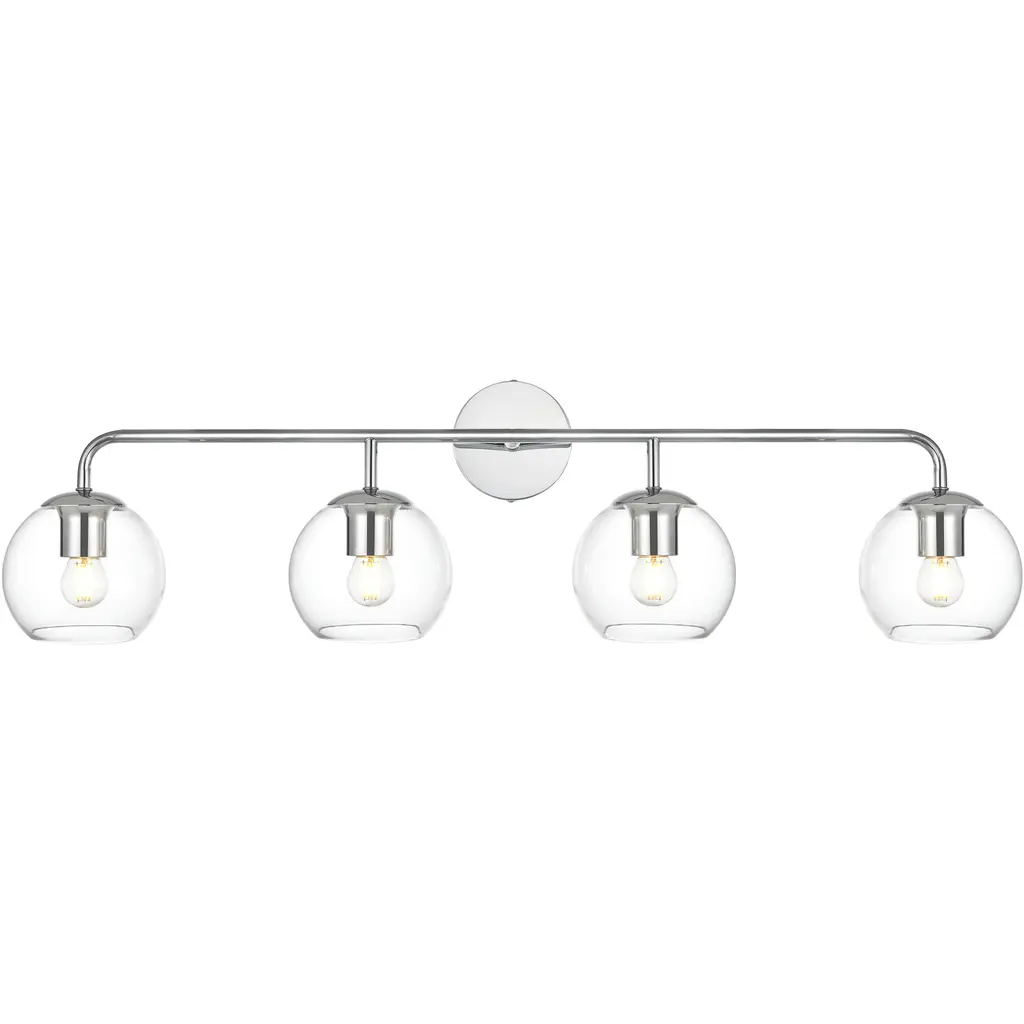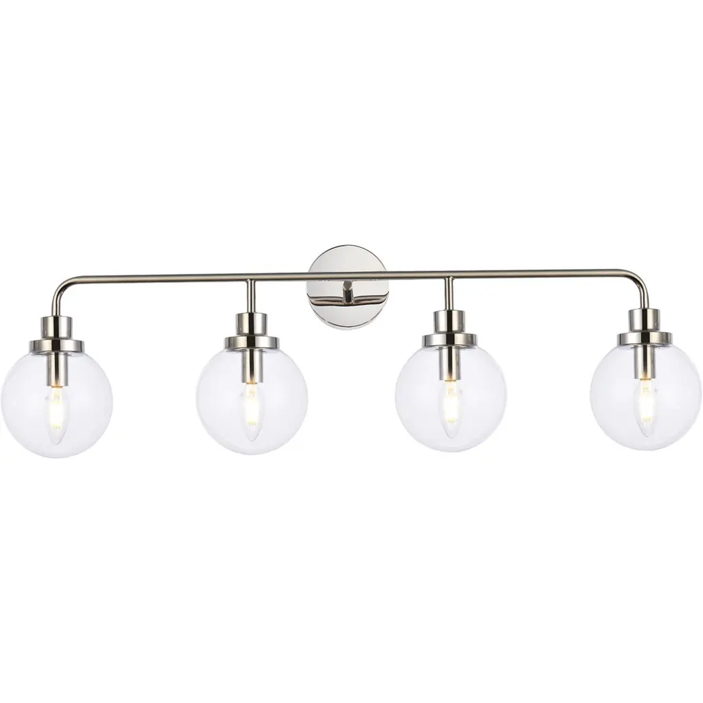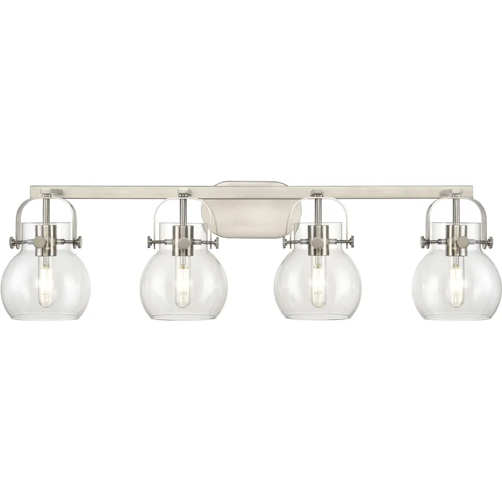 Collection: Lyon, Material: Aluminum, Finish Color: Satin Nickel, Width: 32", Height: 9.75", Depth: 8.5", Lamping Type: Incandescent, Number Of Bulbs: 4, Wattage: 100 Watts, Moisture Rating: Damp Rated, Desc: The rounded, clear shades around the lights of the Lyon series give it a subtle, stylized look. The strong angles and bold lines share space with curved profiles. These fixtures accentuate an uncomplicated approach to design. The Lyon series is perfect for your indoor kitchens, dining rooms, living rooms, or entry foyers. Requires 4 - 100 Watt / Medium Base Bulbs / Damp Listed / Clear Glass Shade. ,