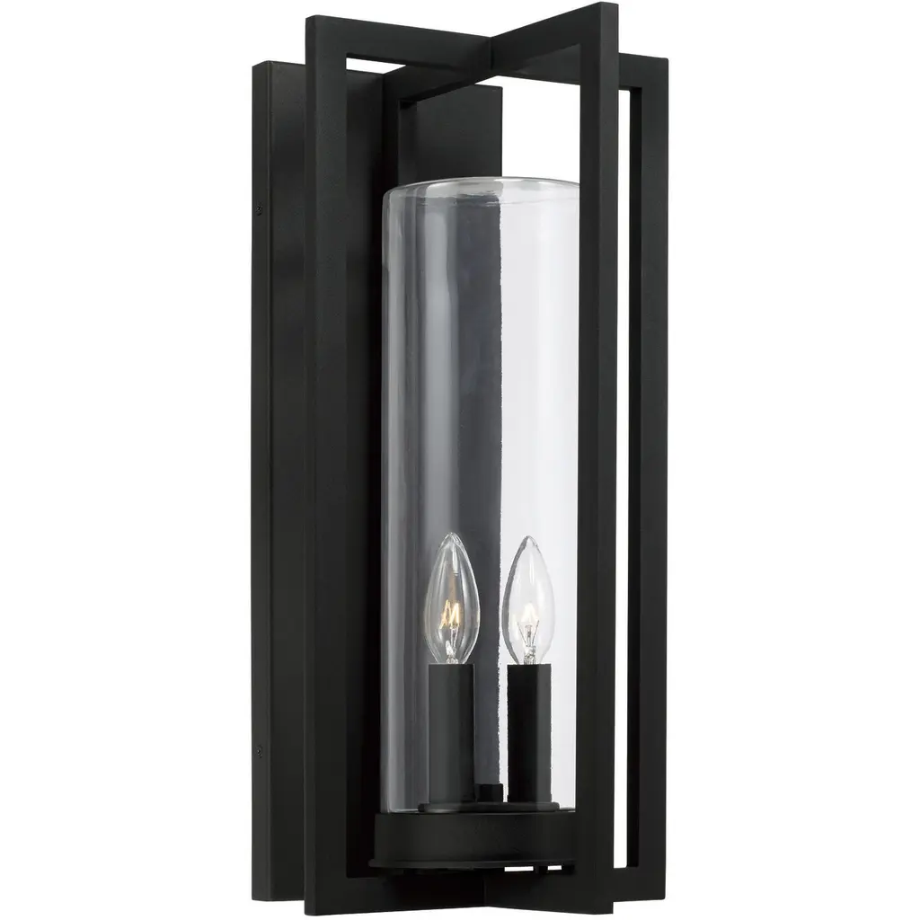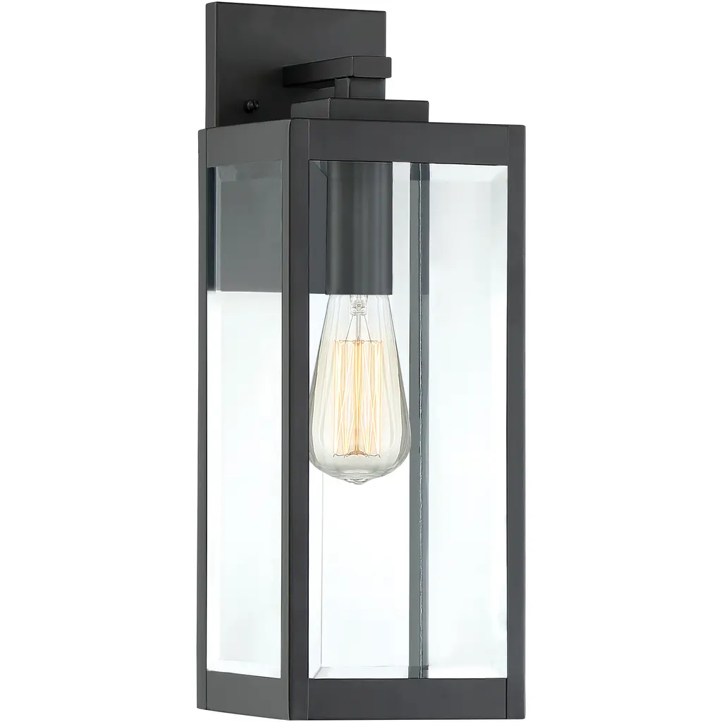Collection: Marco, Finish Color: Textured Black, Width: 7.5", Height: 14.5", Depth: 6.75", Lamping Type: Incandescent, Number Of Bulbs: 1, Wattage: 100 Watts, Moisture Rating: Wet Rated, Desc: Interloping rectangles in a matte black finish allow the Marco family of lights an enhanced edge on style, while coastal grade materials provide the ability to weather the elements. Geometric intrigue coupled with a sturdy build add comfort and style to any patio or front door area. Requires 1 - 100 Watt / Medium Base Bulb / Clear Glass Shade / Costal Grade / Wet Listed. ,