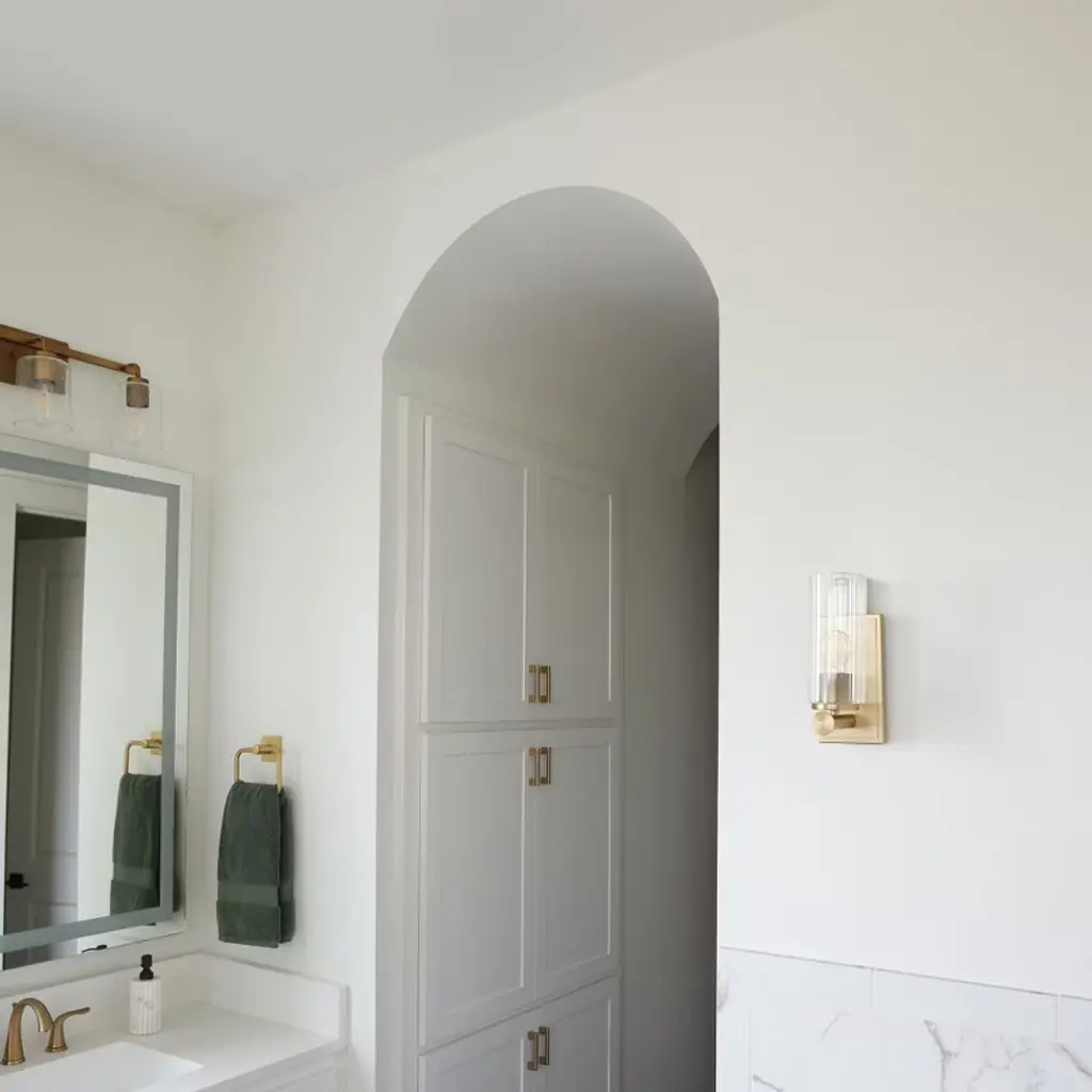 Collection: Juniper, Material: Steel, Finish Color: Aged Brass, Width: 4.75", Height: 11.5", Depth: 6", Height From Outlet Box: 7.25", Backplate Width: 4.75", Backplate Length: 9", Lamping Type: Incandescent, Number Of Bulbs: 1, Wattage: 100 Watts, Moisture Rating: Damp Rated, Desc: Tamara�s first home to air on Bargain Mansions was Juniper. She and her father worked on this home together, and at the end of the build, her father purchased the home. This home�s French chateau design and masculine feel inspired the Juniper collection of linear pendants, wall mounts, vanity lights, and chandeliers. Cylindrical discs details elevate classically shaped arms in the Juniper vanity lights and wall mounts. Slender, clear glass shades echo the silhouette of the frame, supporting a clean, luxurious tone. Wall mount options of 1 or 2 light arrangements and an aged brass or matte black finish provides flexibility for your dining room, home office, or hallway designs.,