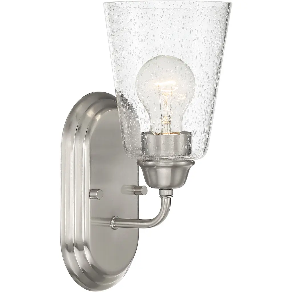 Collection: Starky, Finish Color: Satin Nickel, Width: 5", Height: 15.75", Depth: 6", Lamping Type: Incandescent, Number Of Bulbs: 1, Wattage: 100 Watts, Moisture Rating: Damp Rated, Desc: Clear hammered glass shades sit on matte black or satin nickel frames in the Starky family of traditional lighting fixtures. Choose from wall mounts, vanities, and chandeliers for an ideal addition to a tradtional home. Requires 1 - 100 Watt / Medium Base Bulb / Damp Listed / Clear Hammered Glass Shade. ,