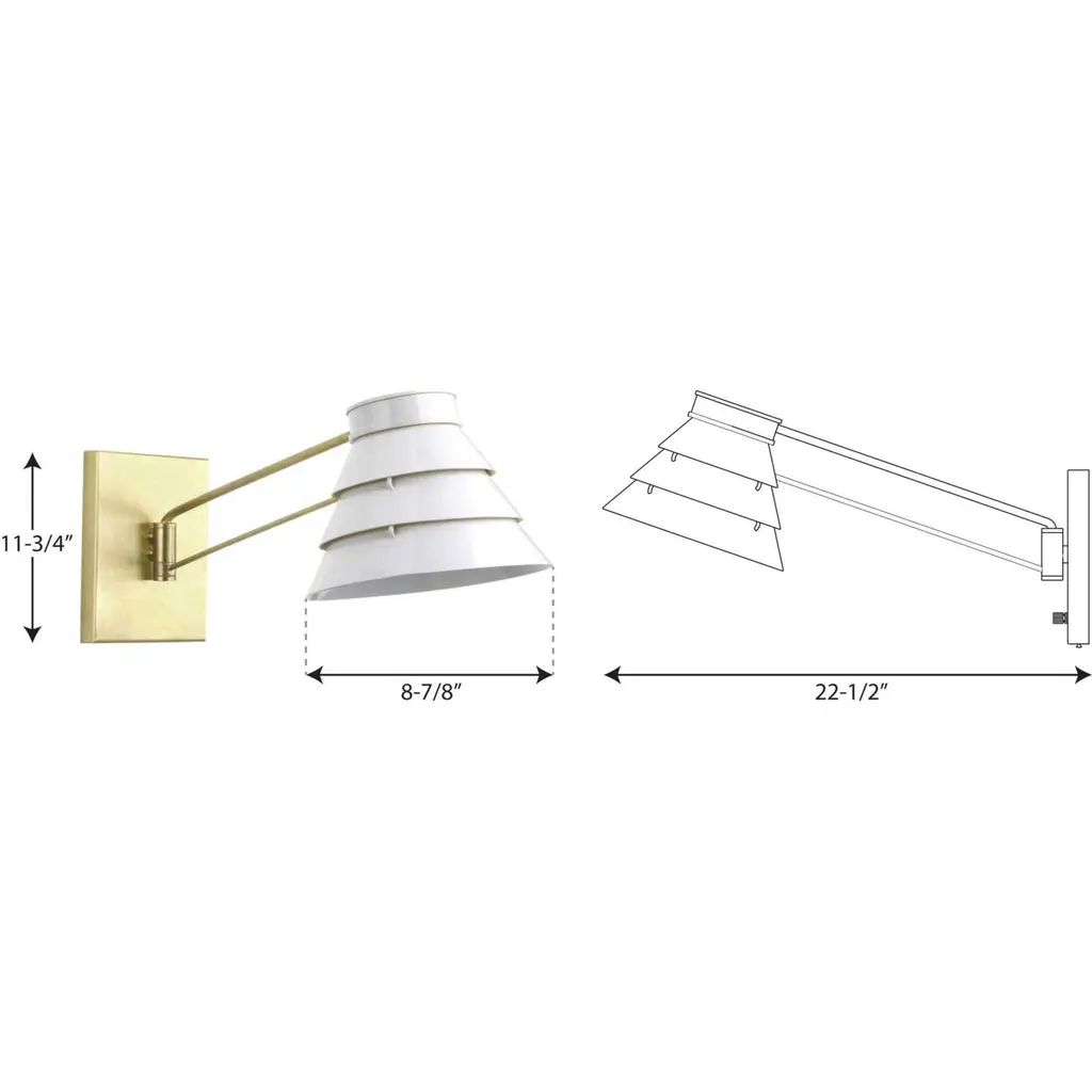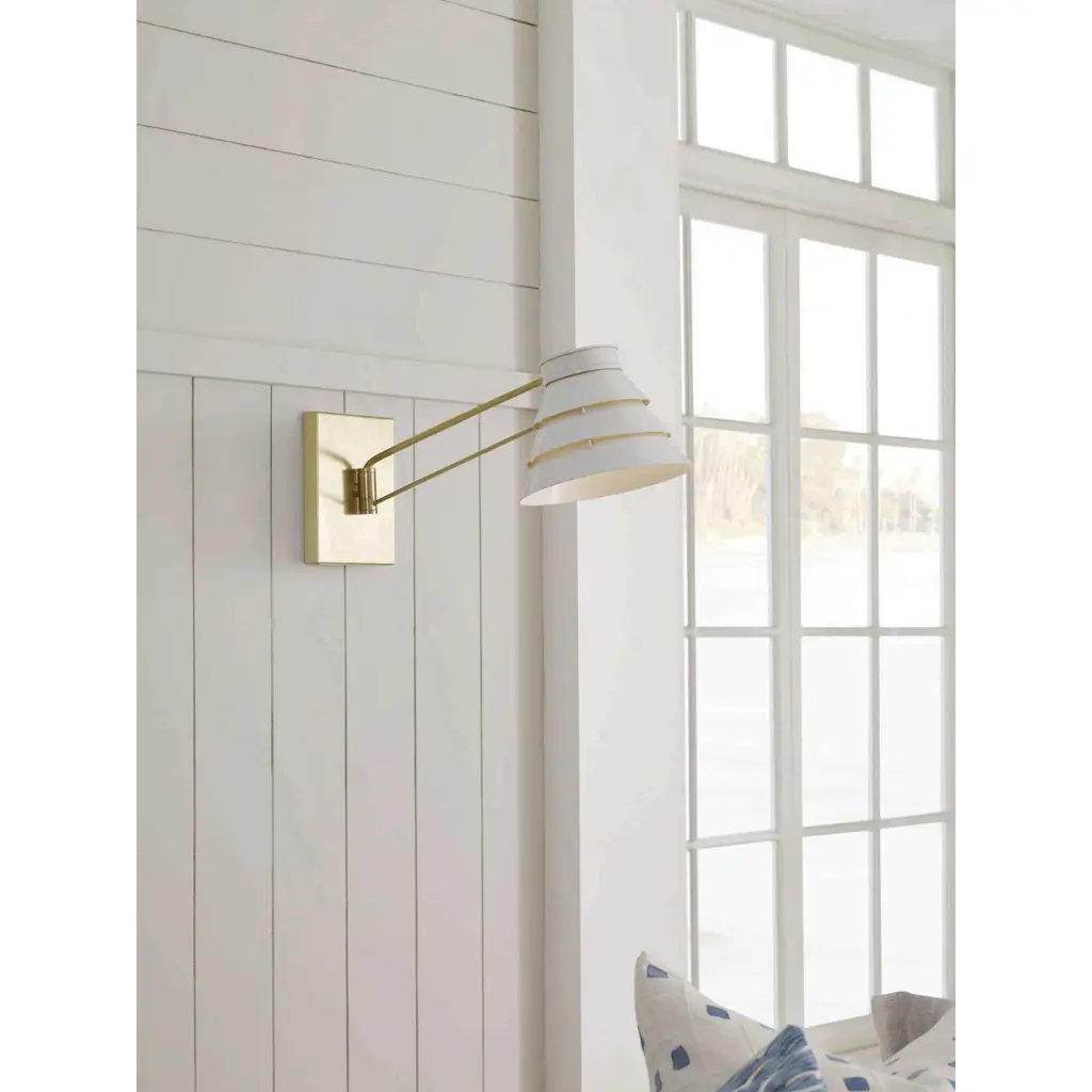 Continuing a modern take on light and movement, the Onshore series combines coastal chic materials and finishes. the Onshore group is a fresh and uplifting choice for casual living. The Onshore swing arm wall sconce in Brushed Brass has a three-tiered white enamel shade that complements this lifestyle. This family of fixtures is part of the Point Dume lighting collection which celebrates a curated mix of yesterday and today, distilling both industrial and artisanal influences.