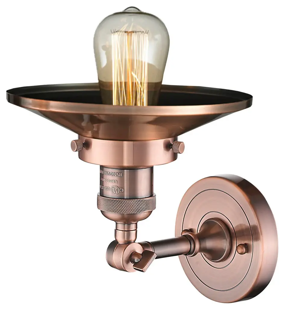 One of our largest and original collections, the Franklin Restoration is made up of a vast selection of heavy metal finishes and a large array of metal and glass shades that bring a touch of industrial into your home.Features:Solid brass 180 degree adjustable swivel with internal teeth that lock in at 5 degree intervals, and engraved cast cupFixture can be hung with bulbs facing up or down as a wall mount, or facing down as a ceiling mount4.5 inch 2mm heavy cast backplateDistance from outlet opening to top of fixture 2.25 inchRated for 100 watt maximumUL/CUL and ETL/CETL damp ratedCompatible with incandescent, LED, fluorescent and halogen bulbsNumber of Bulbs: 1Bulb Wattage: 60Bulb Type: IncandescentBulb Included: NoVoltage: 120Finish: Antique Copper Finish Shade Finish: Antique Copper Shade