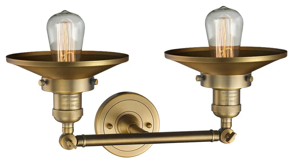 One of our largest and original collections, the Franklin Restoration is made up of a vast selection of heavy metal finishes and a large array of metal and glass shades that bring a touch of industrial into your home.Features:Solid brass 180 degree adjustable swivels with internal teeth that lock in at 5 degree intervalsFixture can be hung with bulbs facing up or down as a wall mount4.5 inch 2mm heavy cast backplateThe interior finish of the shade matches the exterior finish of the shadeRated for 100 watt maximum per socketUL/CUL and ETL/CETL damp ratedCompatible with incandescent, LED, fluorescent and halogen bulbsNumber of Bulbs: 2Bulb Wattage: 60Bulb Type: IncandescentBulb Included: NoVoltage: 120Finish: Brushed Brass Finish Shade Finish: Brushed Brass Shade