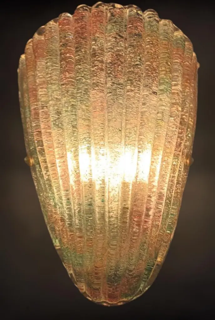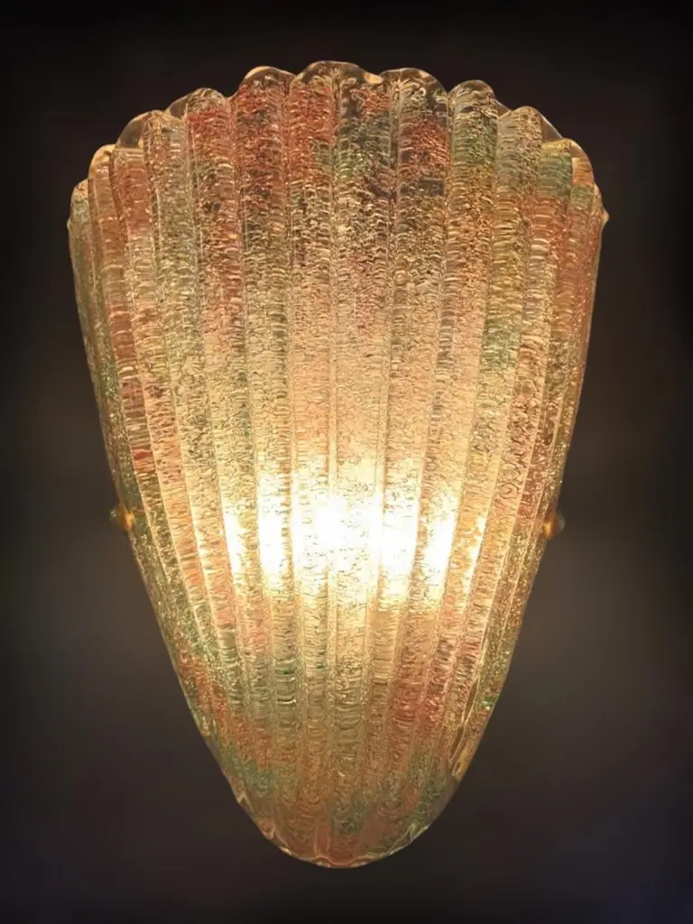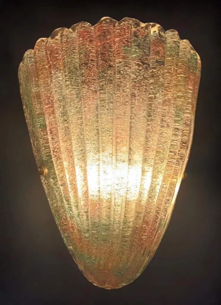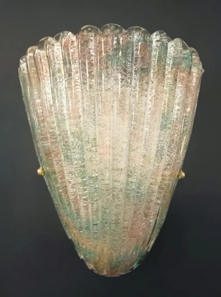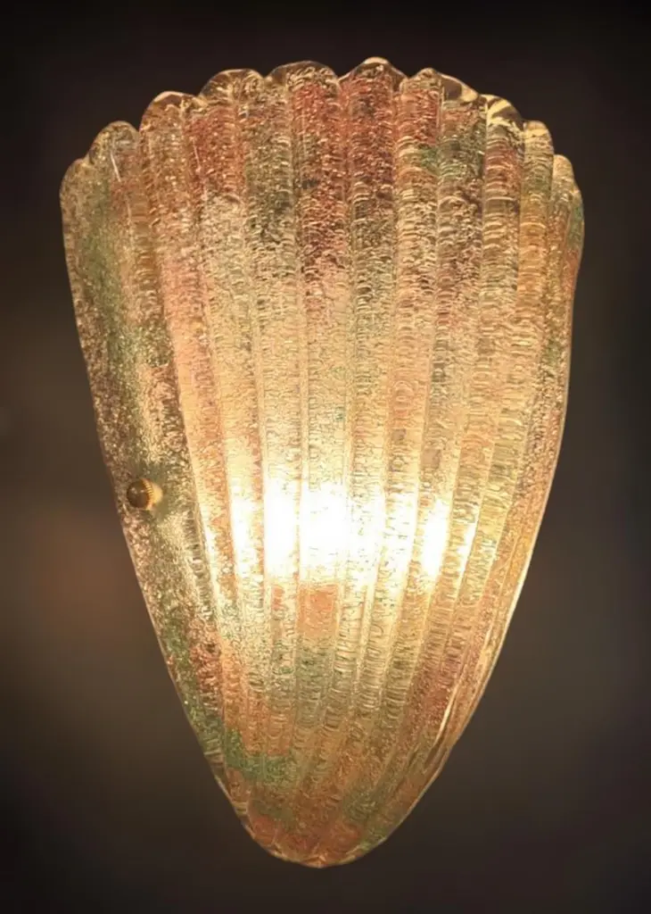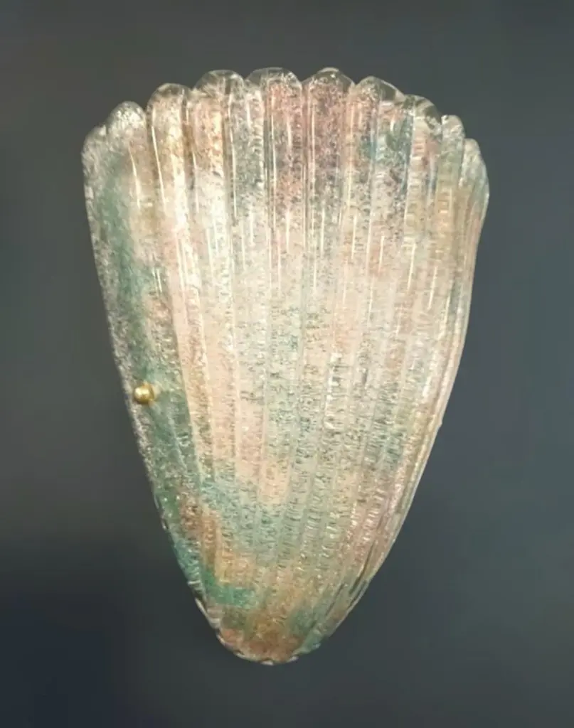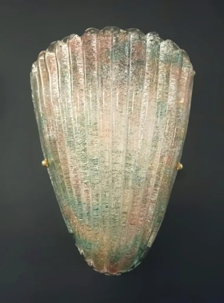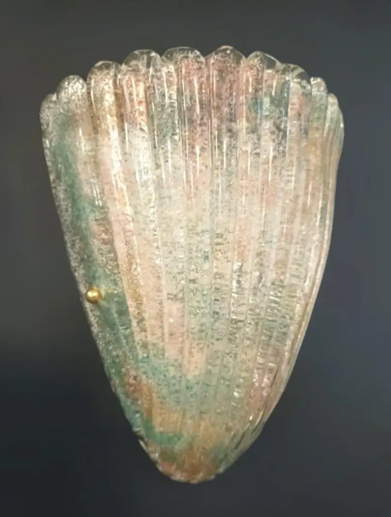 Italian wall light with textured Murano glass shield hand blown with rainbow colored Graniglia to produce granular textured effect, mounted on white metal frame / Made in Italy in the style of Barovier e Toso, circa 1960sMeasures: Height 11.5 inches, width 10 inches, depth 4 inches2 lights / E12 or E14 type / max 40W each3 available in stock in Italy, price listed is for each itemOrder reference #: FABIOLTD H193
