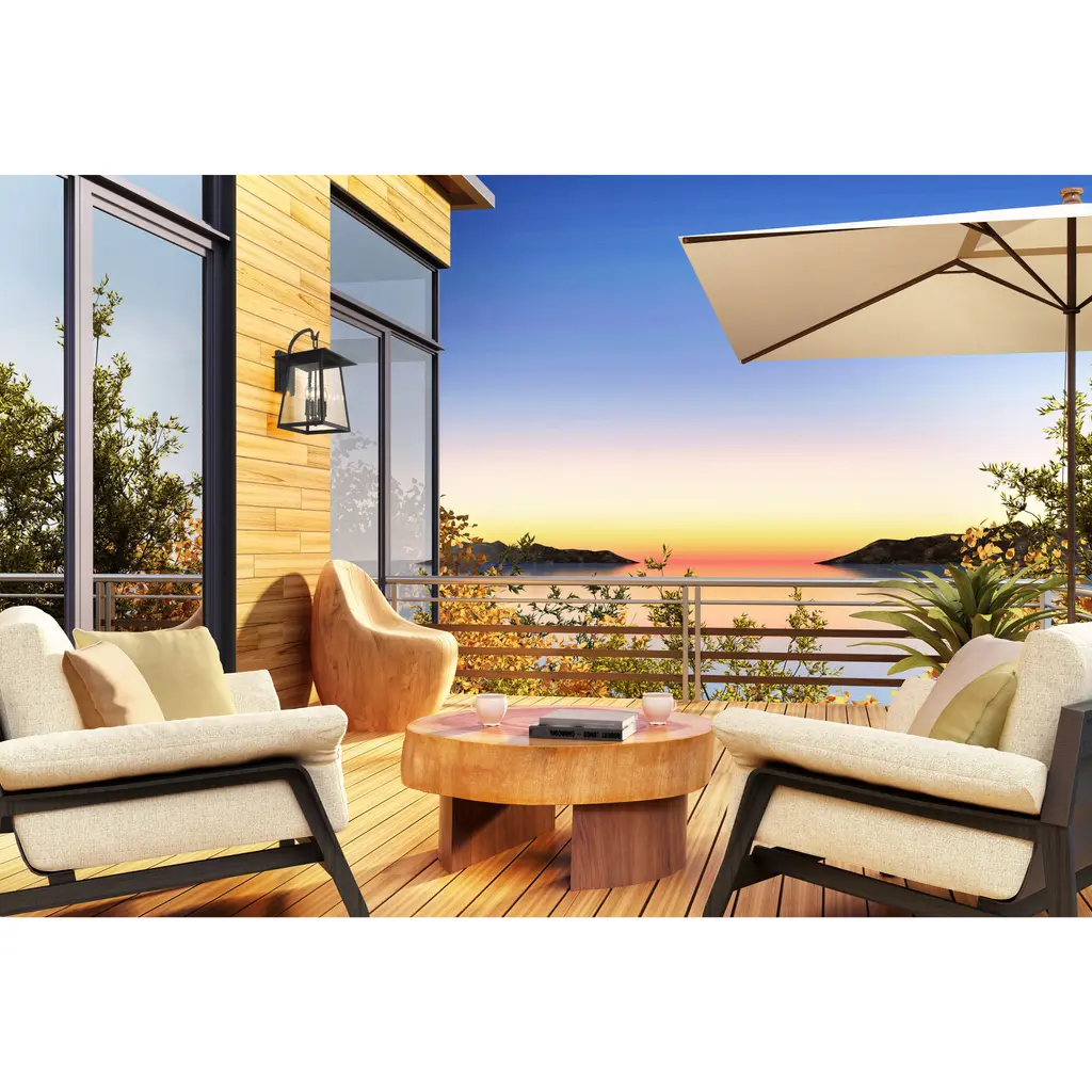 A romantic birdcage motif mixes with the classic lantern design to create a modern four-light outdoor wall light perfect for sprucing up any space. Aluminum framing with a Coastal black painted finish pairs with clear seedy glass, creating an iconic style. This dimmable wall light serves its purpose for illuminating porches, patios, and pool houses.