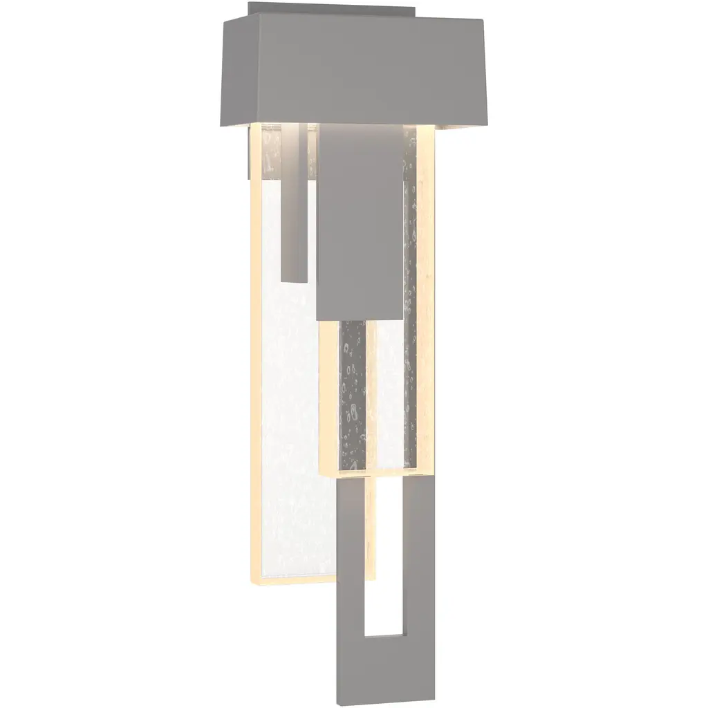 Cascades of thick seeded glass and layers of metal create a bold and sophisticated display of elements. The large Rainfall sconce combines traditional architectural forms with streams of textural light play.