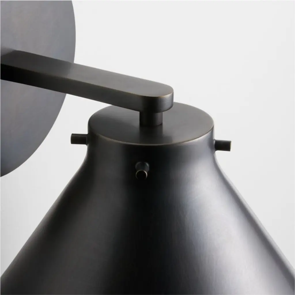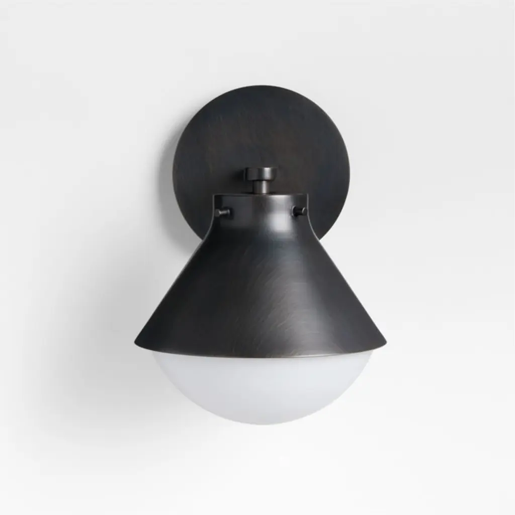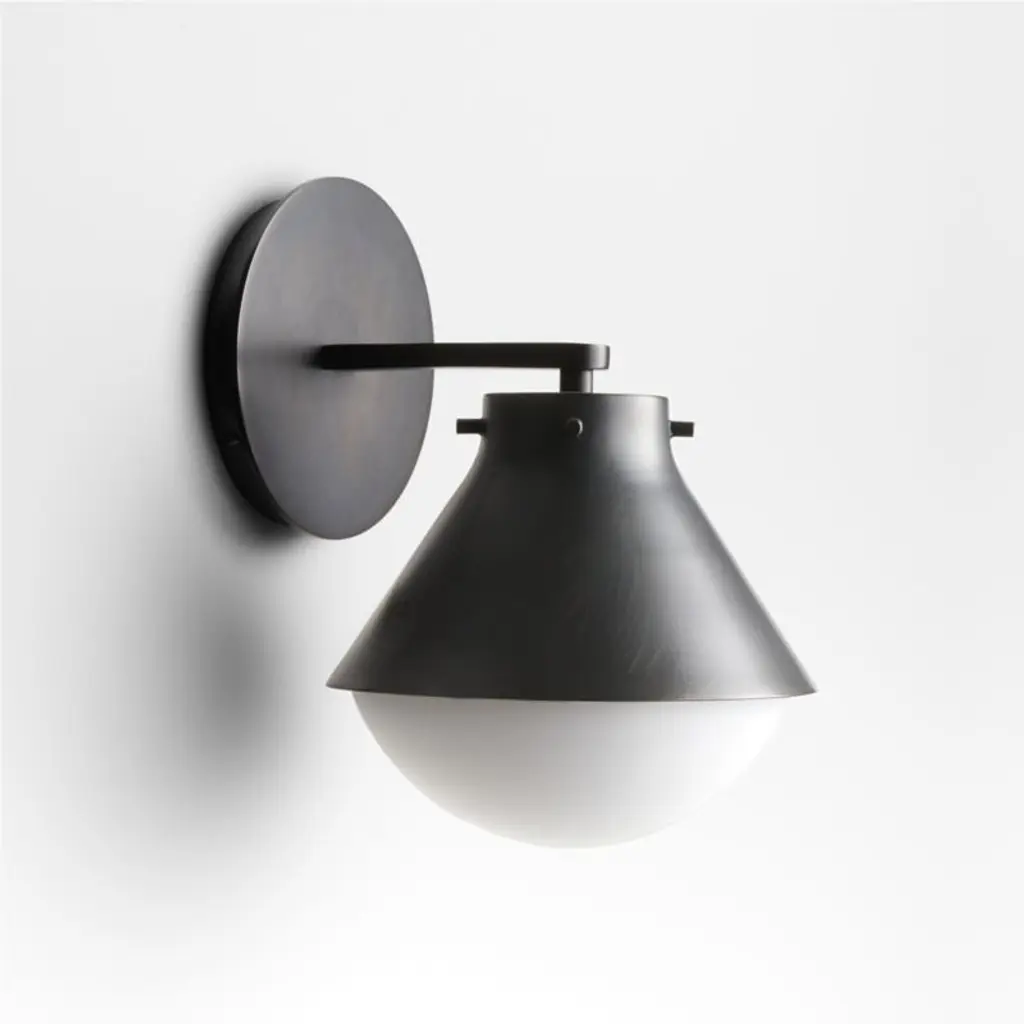 Classic and contemporary, Rainier softens the classic conical sconce by finishing a flared shade with a curve of frosted glass to create a teardrop-like silhouette. The high-contrast pairing of the blackened steel fixture with the white milk glass is graphic. We love the wall light offering softly diffused illumination flanking a bookcase, doorway or bathroom mirror.