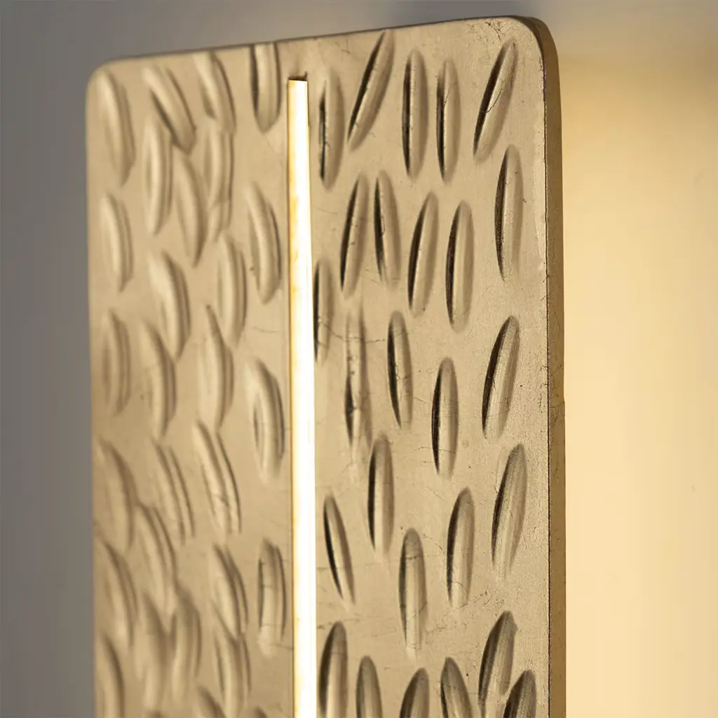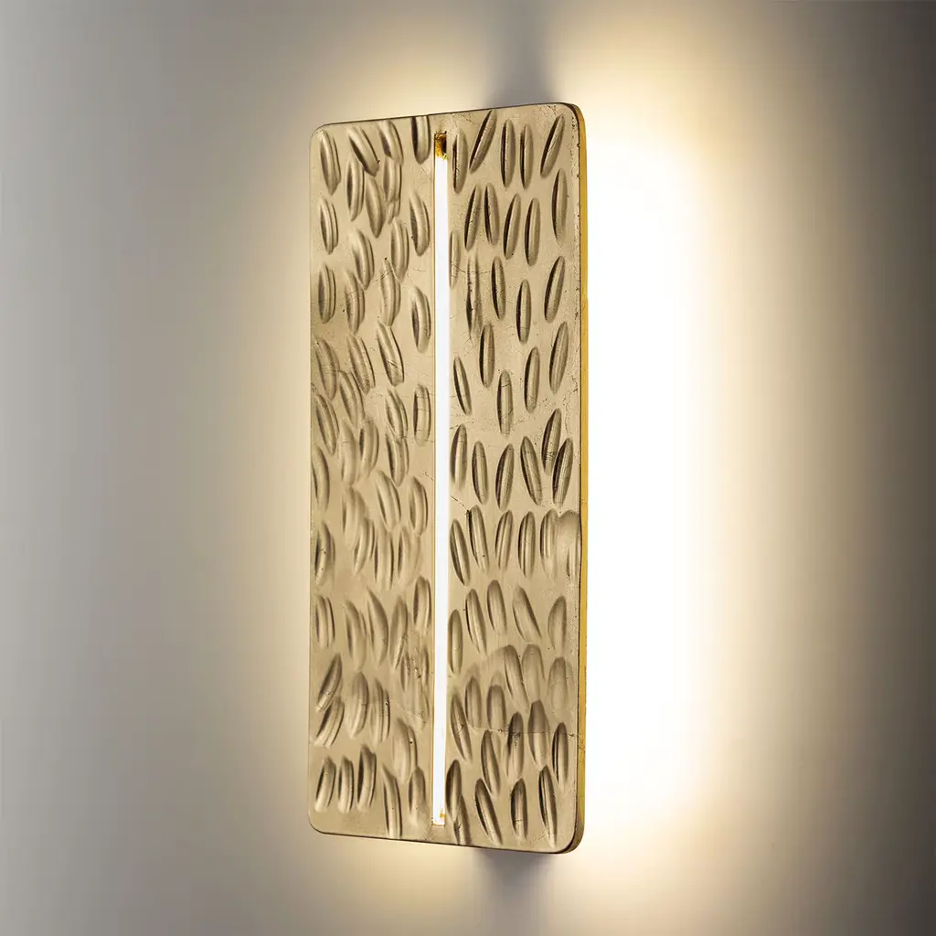 Transcending mere utility, this gilded wall lamp is a symbolic artistic marvel. Its textured, chiseled metal surface is a masterful canvas, interrupted by a slender fissure that emanates a radiant glow – a symbolic glimmer of light, a beacon of hope amidst the darkness. This exquisite design creates an ethereal visual poetry, casting an original, captivating illumination that transforms any space into a realm of artistic brilliance. For US electrified version, a disk of the same finish will be applied behind the lamp base to hide the jbox. Please contact the Concierge for more information.