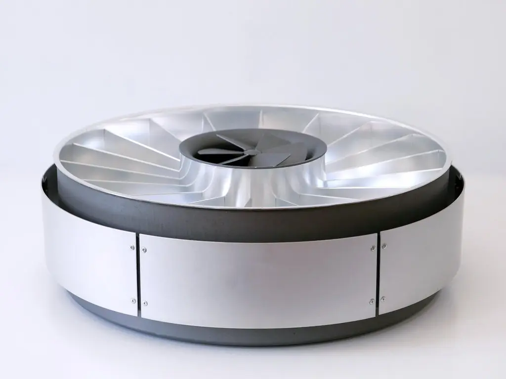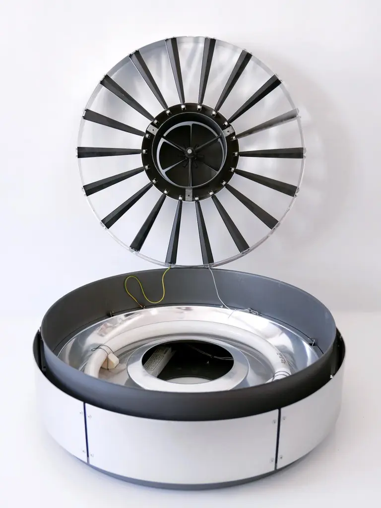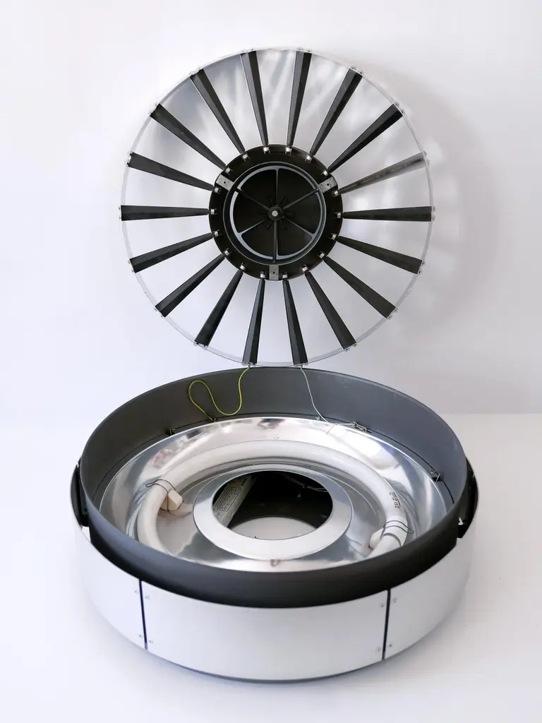 Rare, elegant, large & highly decorative Modernist Ceiling Lights or Sconces. Originally designed by Britisch Star Architect Richard Rogers for Lloyds headquarters in London, built by him between 1977 and 1987. 6 x Identical fixtures are available!Provenance:Süddeutsche Zeitung publishing house, Sendlinger-Tor-Straße, Munich, demolished in 2010.Executed in partly powder-coated and polished aluminium and metal, the chandelier needs 1 ring fluorescent light. It is wired, in working condition and runs on 230 volt. For use with 110 volt, they need to be rewired.Dimensions:Dm 23.63 in. (60 cm)H 7.48 in. (19 cm)Condition:Good original vintage condition. Wear consistent with use and age.