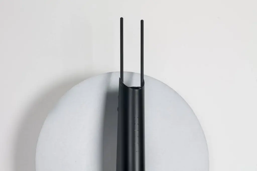 Futuristic 'Copernicus' sconces by Piotr Sierakowski for Koch and Lowy, with metal dish reflector and long insectile black shade. New old stock; unused. (Eight available).