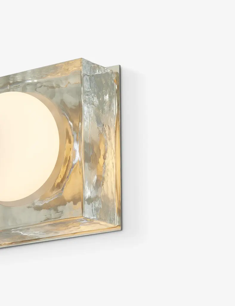 Statement lighting can come in any size. This small wall sconce is an absolute stunner with its opal globe set in a thick cast glass cube and fitted with a glossy backplate. Styled alone or in multiples, the Ravi square sconce is a glam addition to the room.