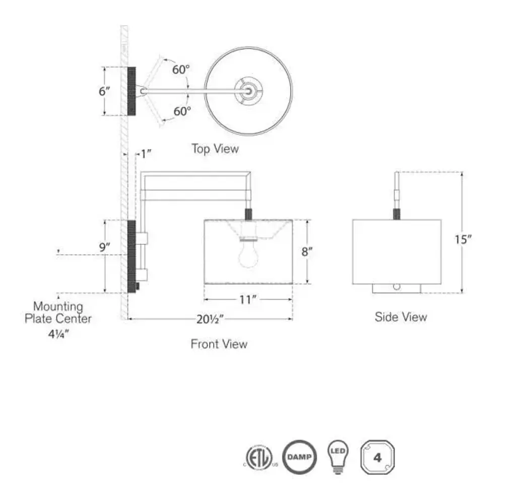 Chic and functional, the Gael by Ray Booth showcases the timeless combination of metal and linen explored through a rectangular mount and circular barrel shade. Designed with a rotating mount that allows for precise and flexible light placement, the wall fixtures come in a range of sizes that can hang effortlessly over sofas and chairs or small tables. Designer: Ray Booth Height: 15" Extension: 20.5" Backplate: 6" x 9" Rectangle Mounting: Hardwire Shade Detail: 11" x 11" x 8" Socket: E26 Keyless w/ Dimmer on Backplate Wattage: 15 LED A19 Safety Rating Location: Damp Assembly Required? Yes