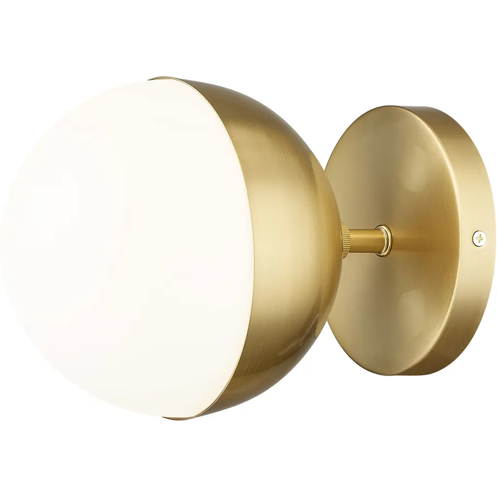 Enjoy the richness and warmth of this mid-century one-light globe wall sconce and its modern gold finish. Its depth and character complement an orb silhouette and moveable metal shield, creating precise lighting perfect for everything from reading to ambiance. The round fixture is secured with a matching wall plate, offering a cool, streamlined look and feel.