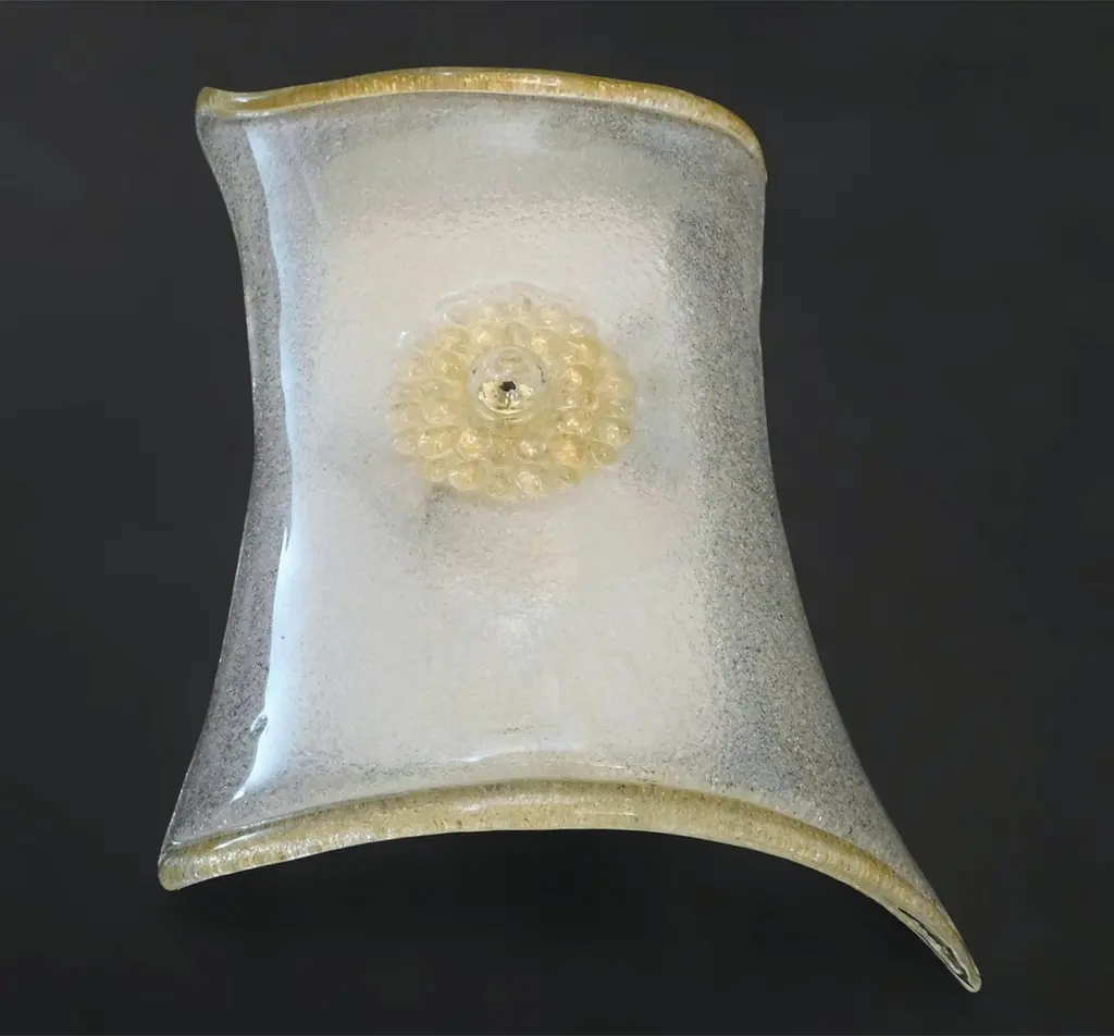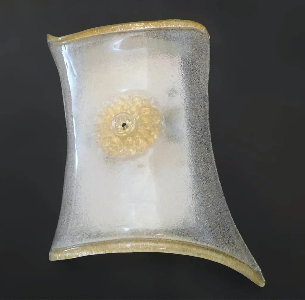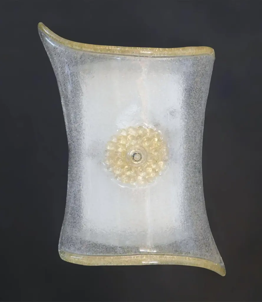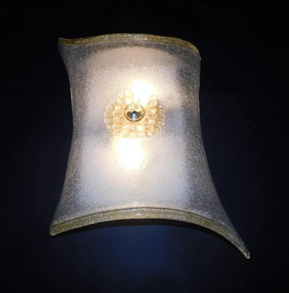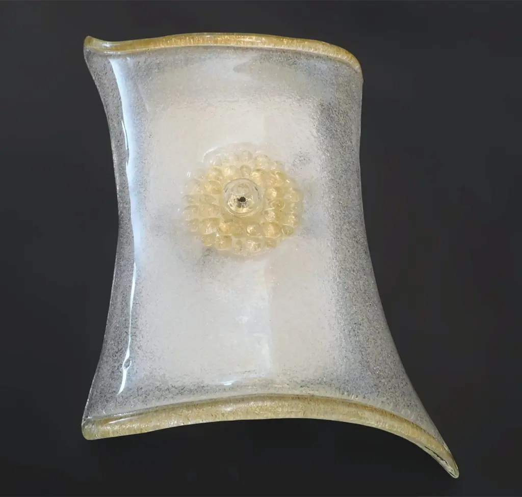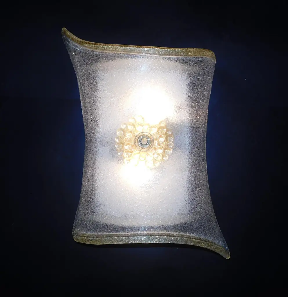 Vintage Italian wall light with a Murano glass shade hand blown in Graniglia technique to produce granular textured effect infused with gold flecks, mounted on white frame / Made in ItalyMeasures: Height 20.5 inches, width 16 inches, depth 5 inches2 lights / E26 or E27 type / max 60W each3 available in stock in Italy, price listed is for each itemOrder reference #: FABIOLTD L64