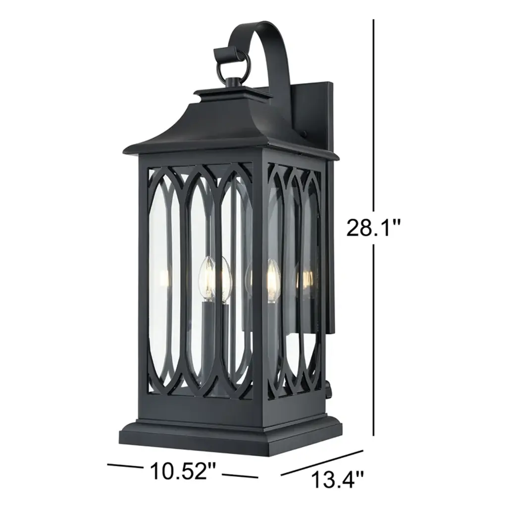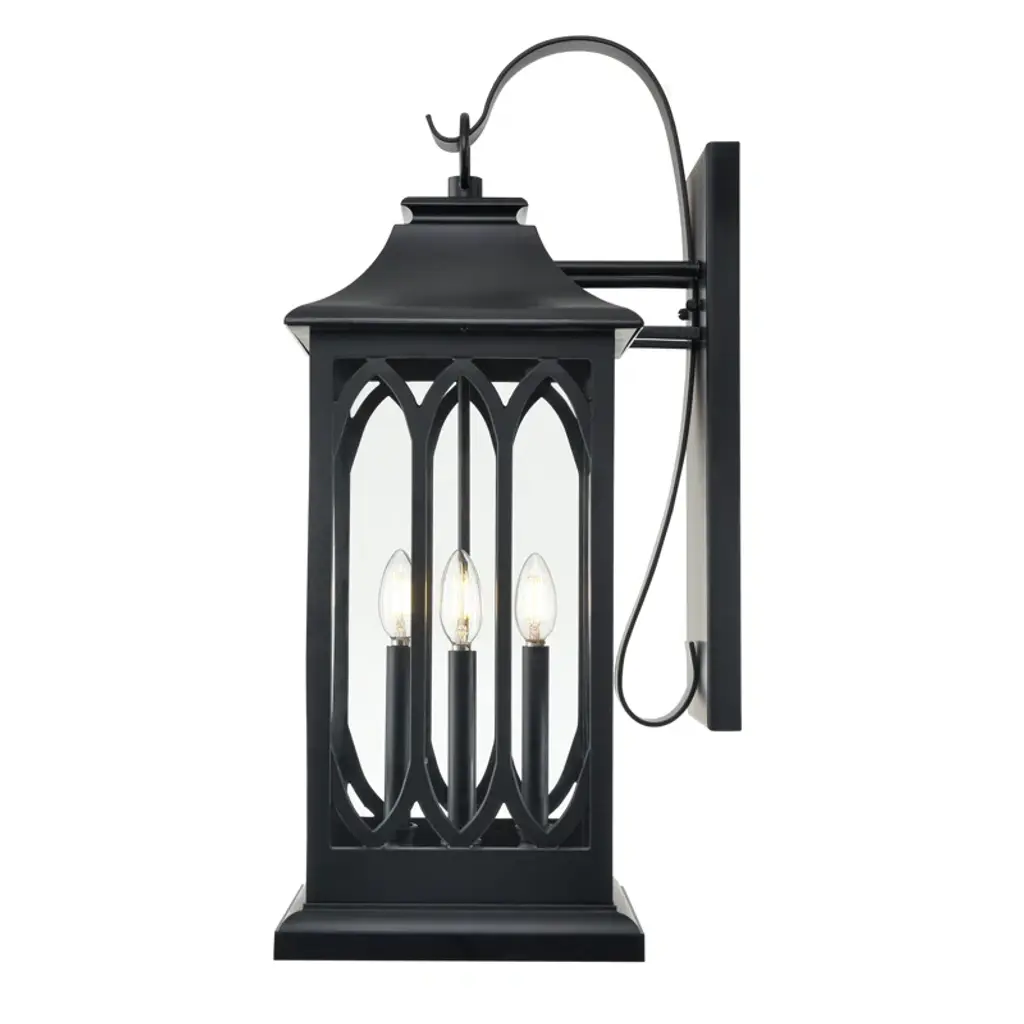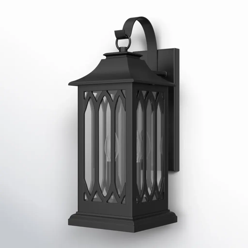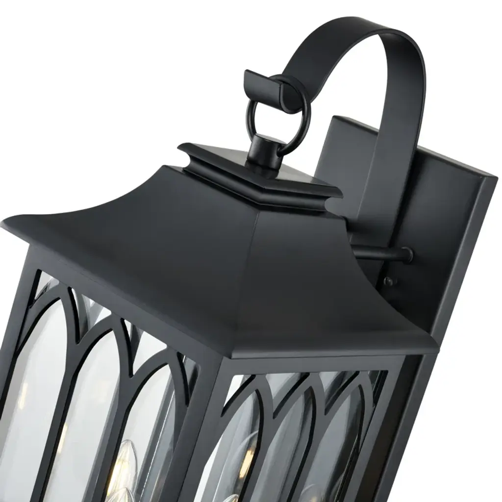 Exquisite metalwork creates wonderful light play for the Mallorey Family of outdoor lighting. The aluminum housing, finished in powder coated black, is punctuated with a modern spin on Gothic-style arches and the traditional hook-and-arm profile.