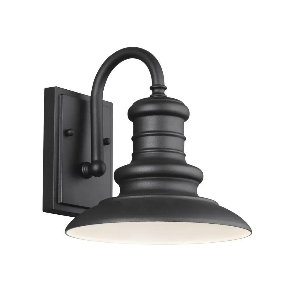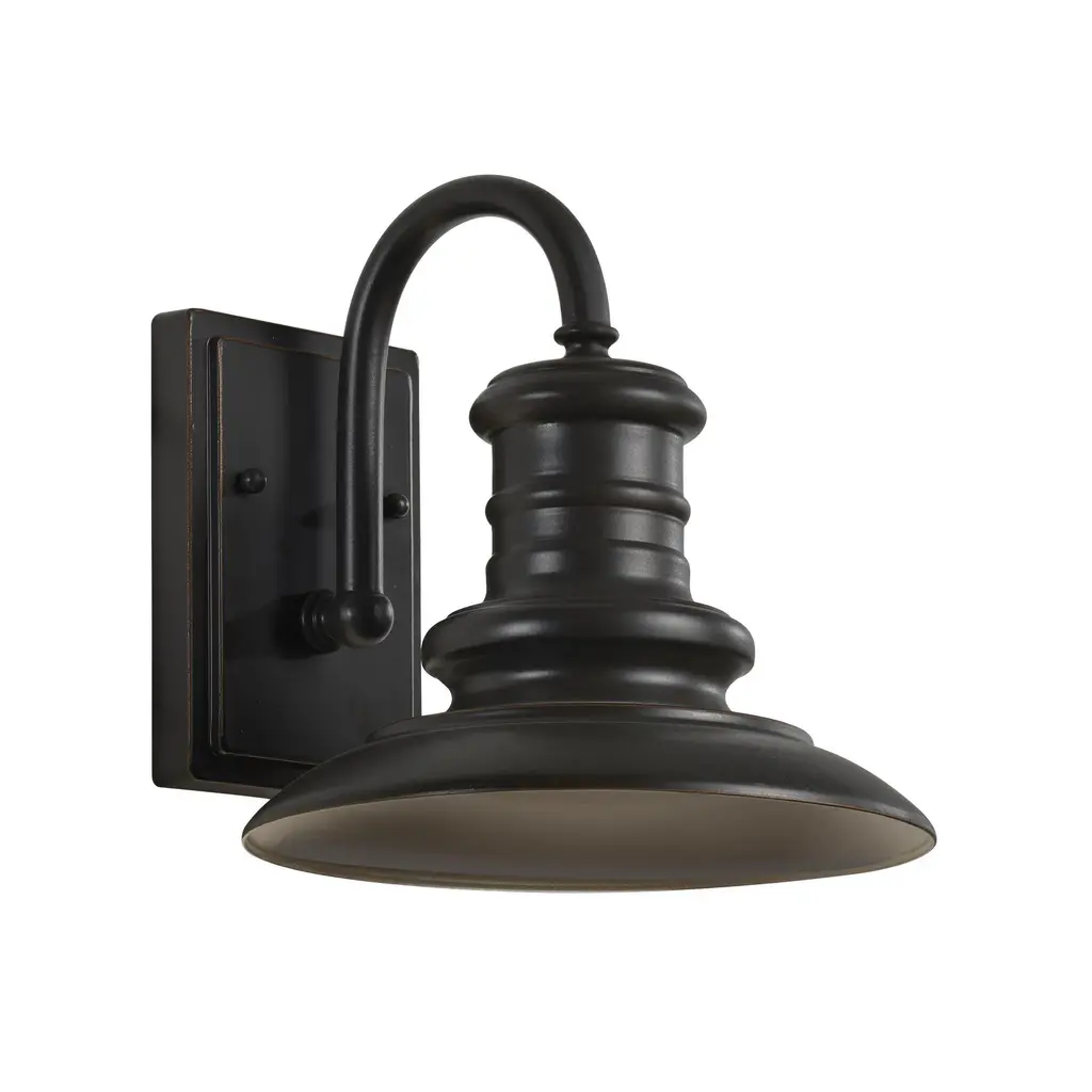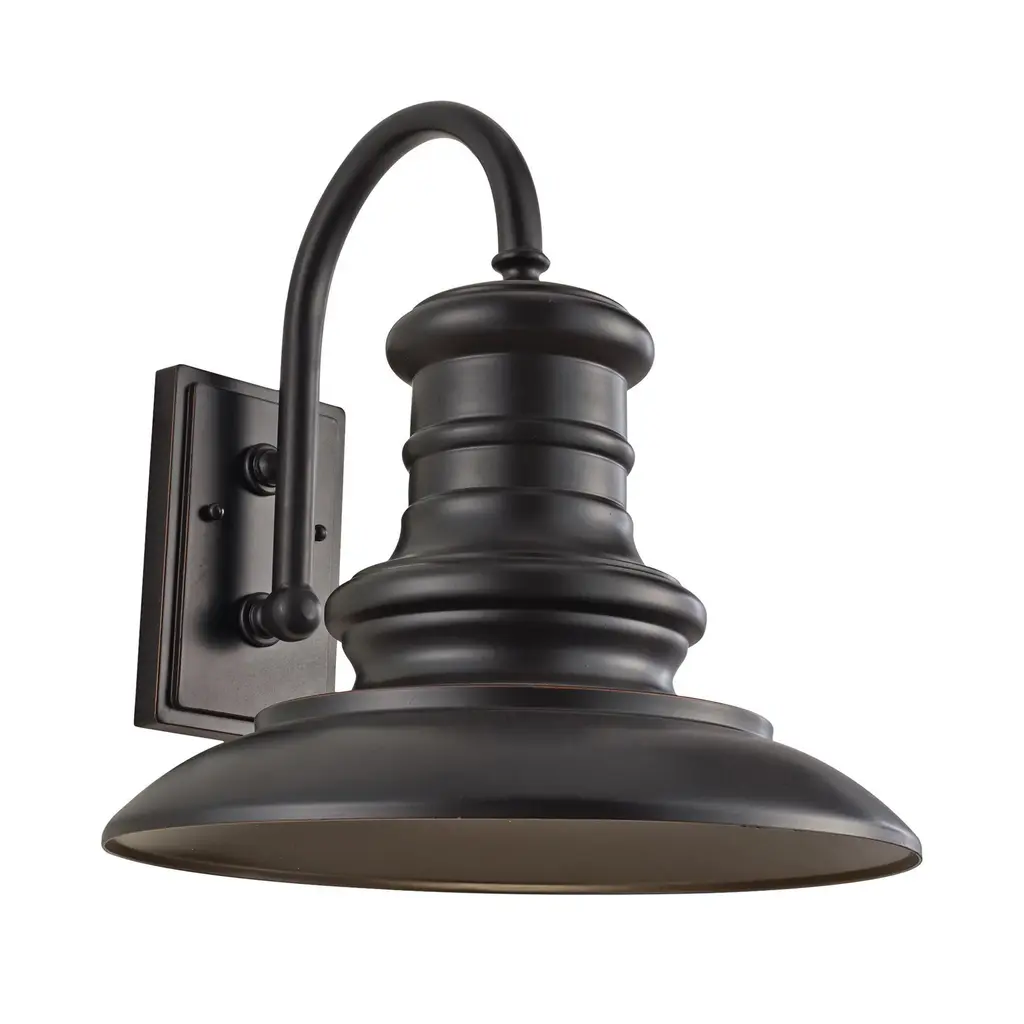 The Redding Station one light outdoor wall fixture creates a warm and inviting welcome presentation for your home's exterior. Reminiscent of old railroad lighting, Redding Station warmly illuminates its surroundings with a vintage vibe. The all-aluminum shades feature textured details. Redding Station is available in three sizes (Small, Medium, Large) and finish options: Restoration Bronze and Textured Black. Features
