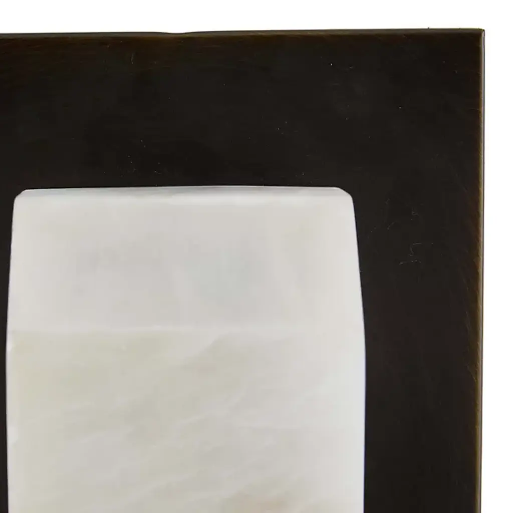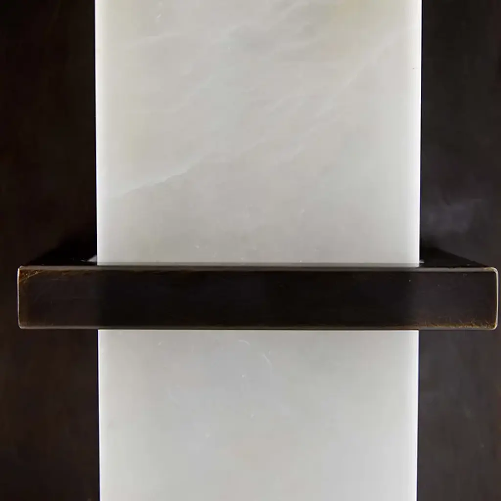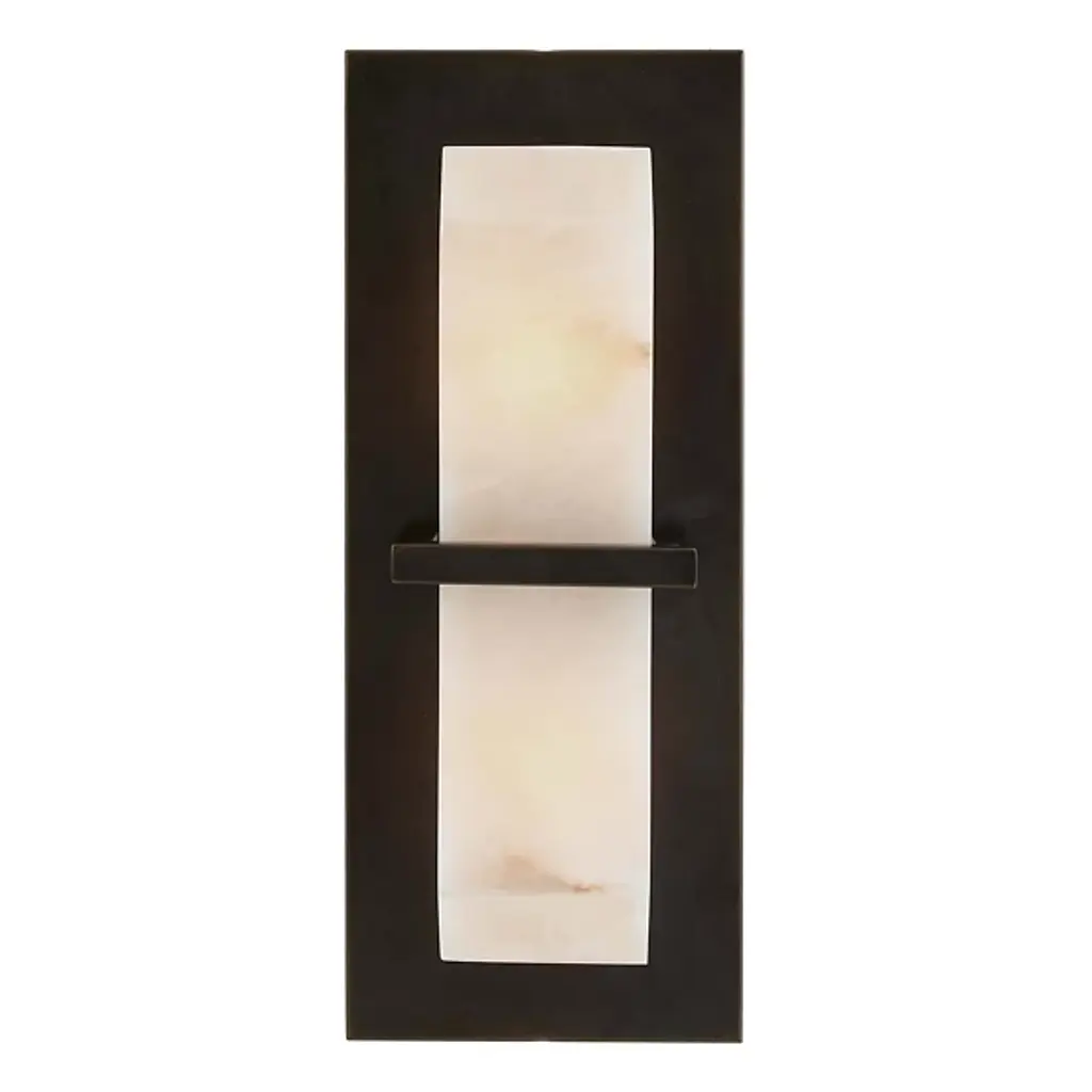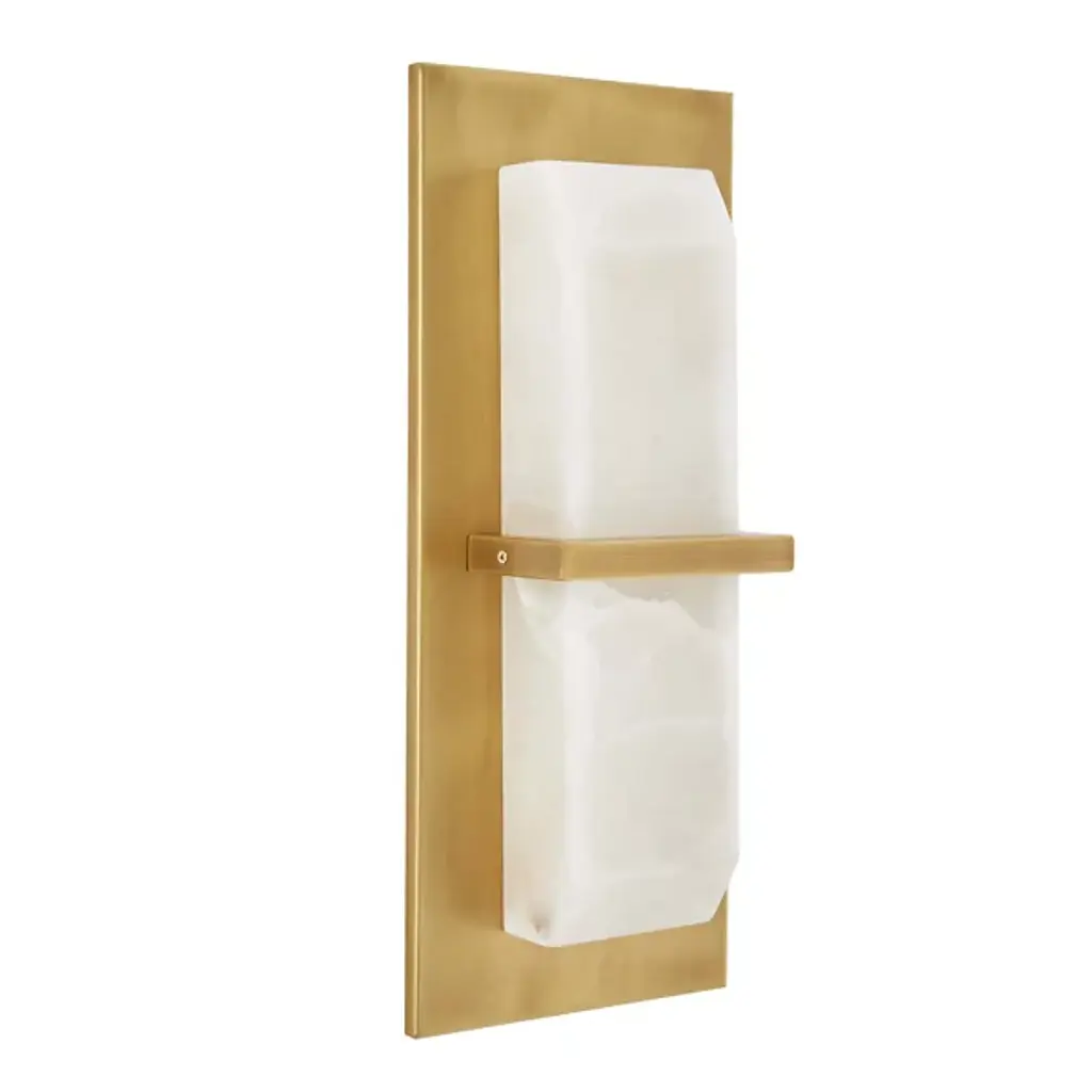 Clean-cut and light filtering like a fine jewel. The Redmond Wall Sconce from Arteriors creates a sophisticated mood with ideal light and a sharp silhouette. The sconce harnesses geometry to accommodate the modern and contemporary setting. It sports a low-profile rectangular backplate one can easily imagine next to an entryway or in between picture frames. This metal backplate’s bold finish brings out the delicate vein accents of the natural alabaster diffuser in front. The faceted alabaster seduces with a golden aura that glazes its surroundings.