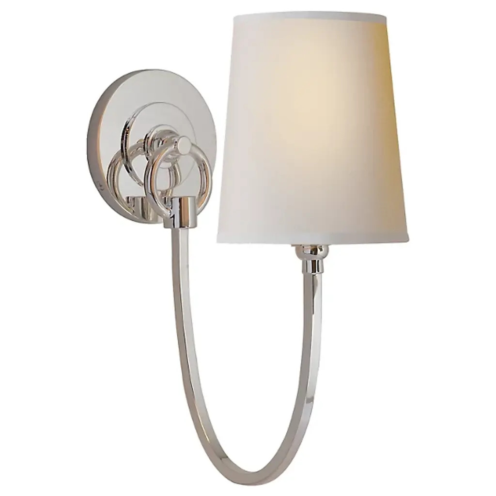 The Reed Wall Sconce by Visual Comfort Signature, formerly known as Visual Comfort, will bring simple, subtle, and refined style to your chosen space. A wall plate of concentric circles supports a faceted, swooping arm which leads to a slightly tapered, Natural Paper shade. Light is expertly diffused from there. Dimmable with a standard incandescent dimmer (not included). Designed by Thomas O’Brien.