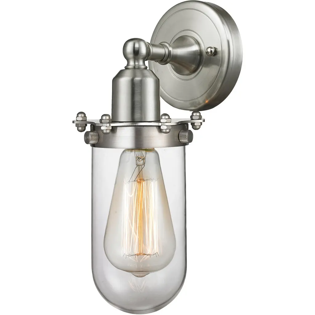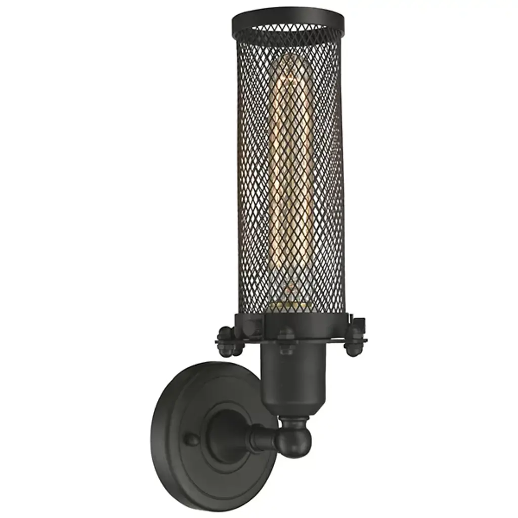 Bring style to your interiors with the intriguingly-constructed Reese Wall Sconce by Alder & Ore. Simple in design, it uses a circular wall mount to send out a short stem to support a downward-facing socket. The lamping is surrounded by a cylindrical mesh shade that mellows direct glare into a pleasant glow all around the fixture, shining off the contoured metalwork above. The fixture is damp-rated for use anywhere indoors and shines as part of a matched set.