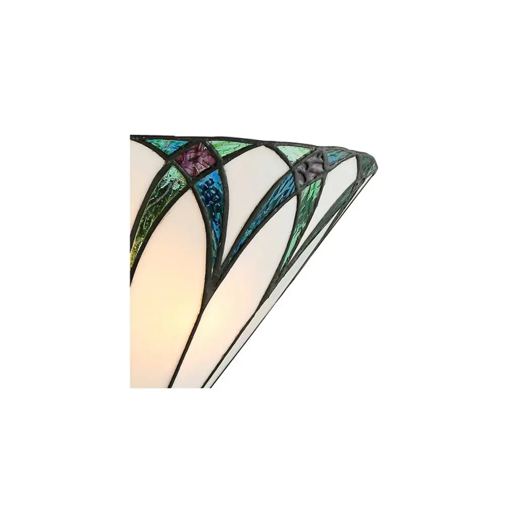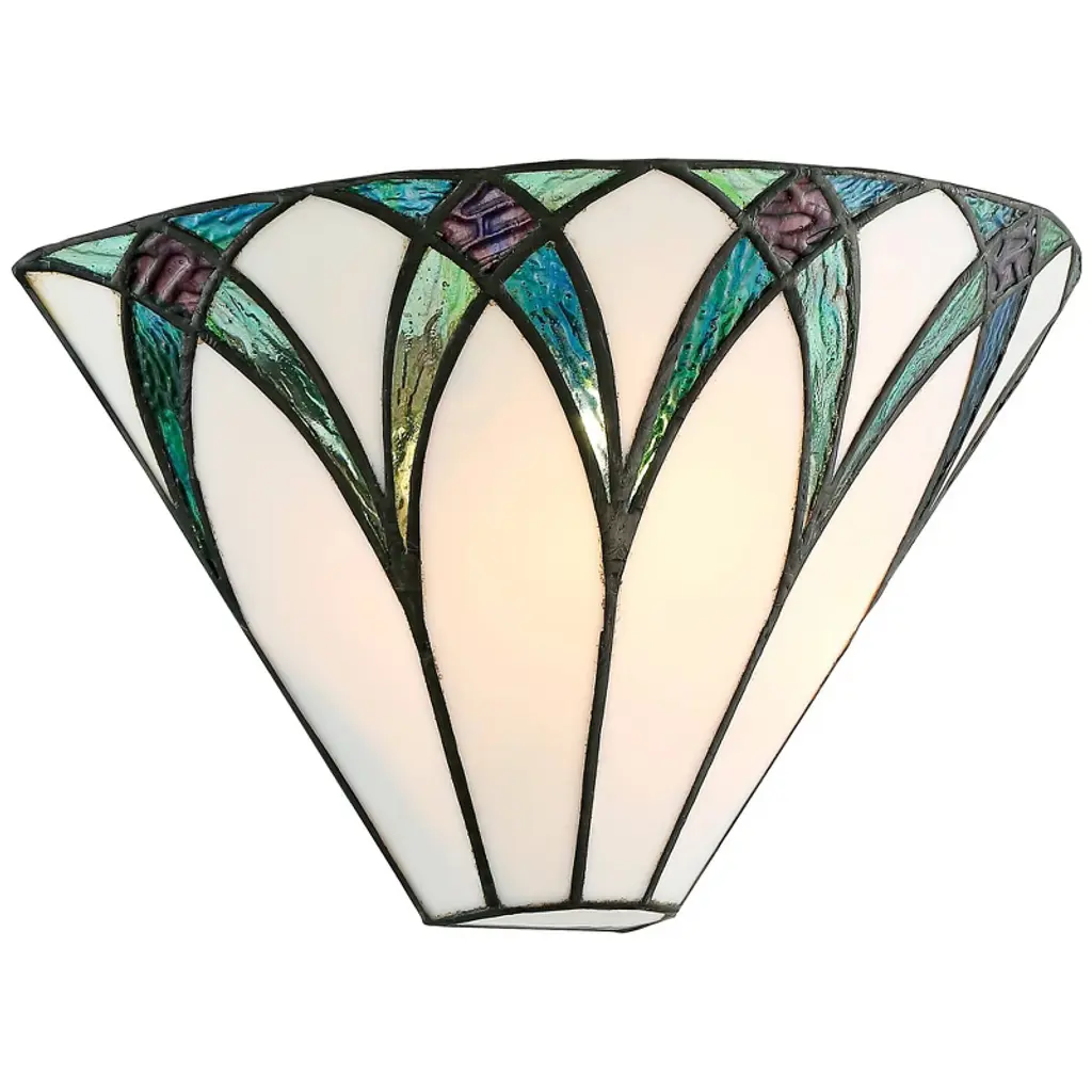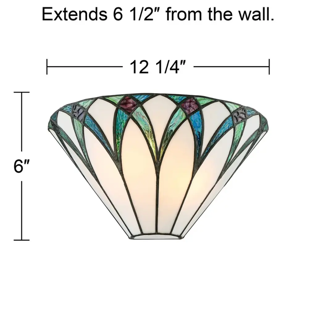 Inspired by classic Tiffany designs, this set of two wall sconces is a delightful design from Regency Hill. Art glass panels in neutral tones are complemented by blue glass pieces. Bronze finish hardware completes the traditional look. Use this light to create a stylish look for any hallway or living area.