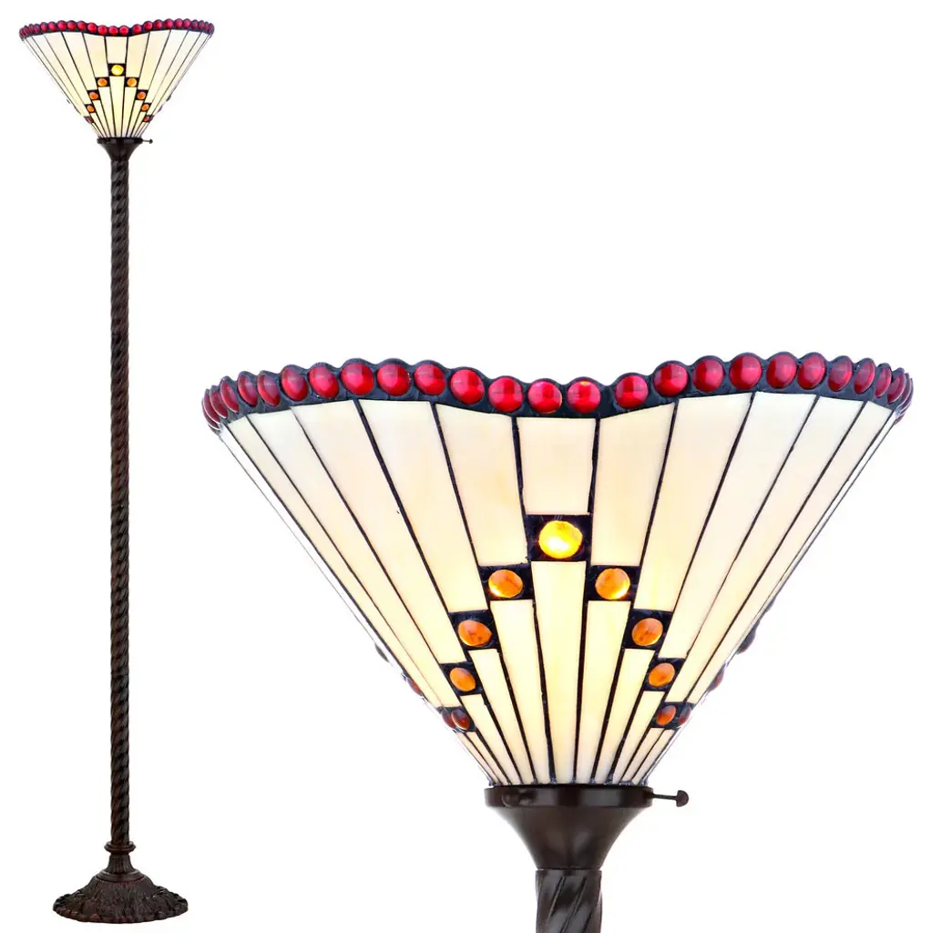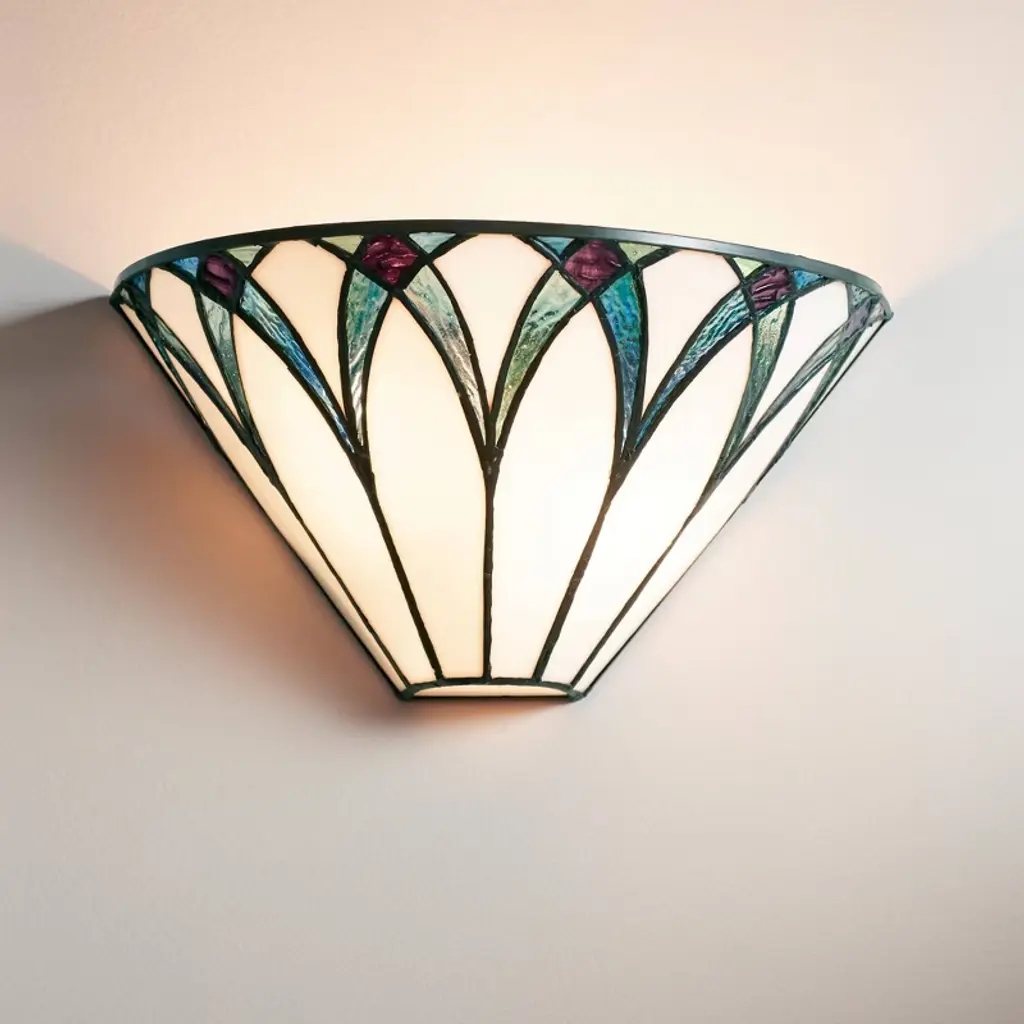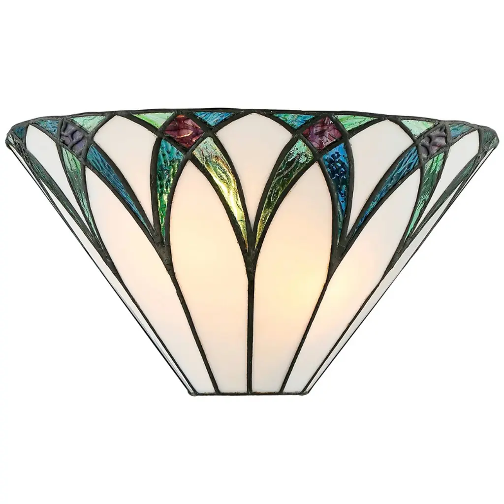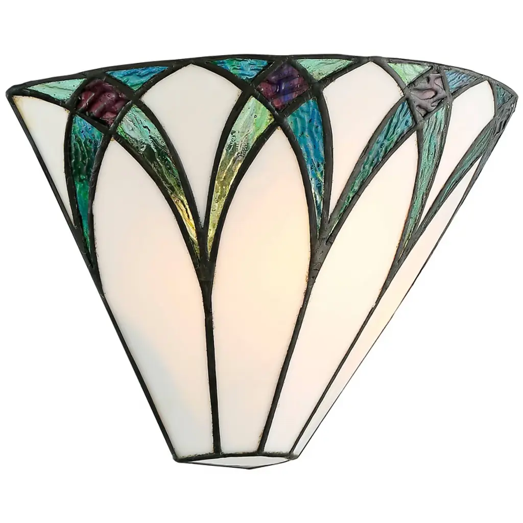 Inspired by classic Tiffany designs, this set of two wall sconces is a delightful design from Regency Hill. Art glass panels in neutral tones are complemented by blue glass pieces. Bronze finish hardware completes the traditional look. Use this light to create a stylish look for any hallway or living area.