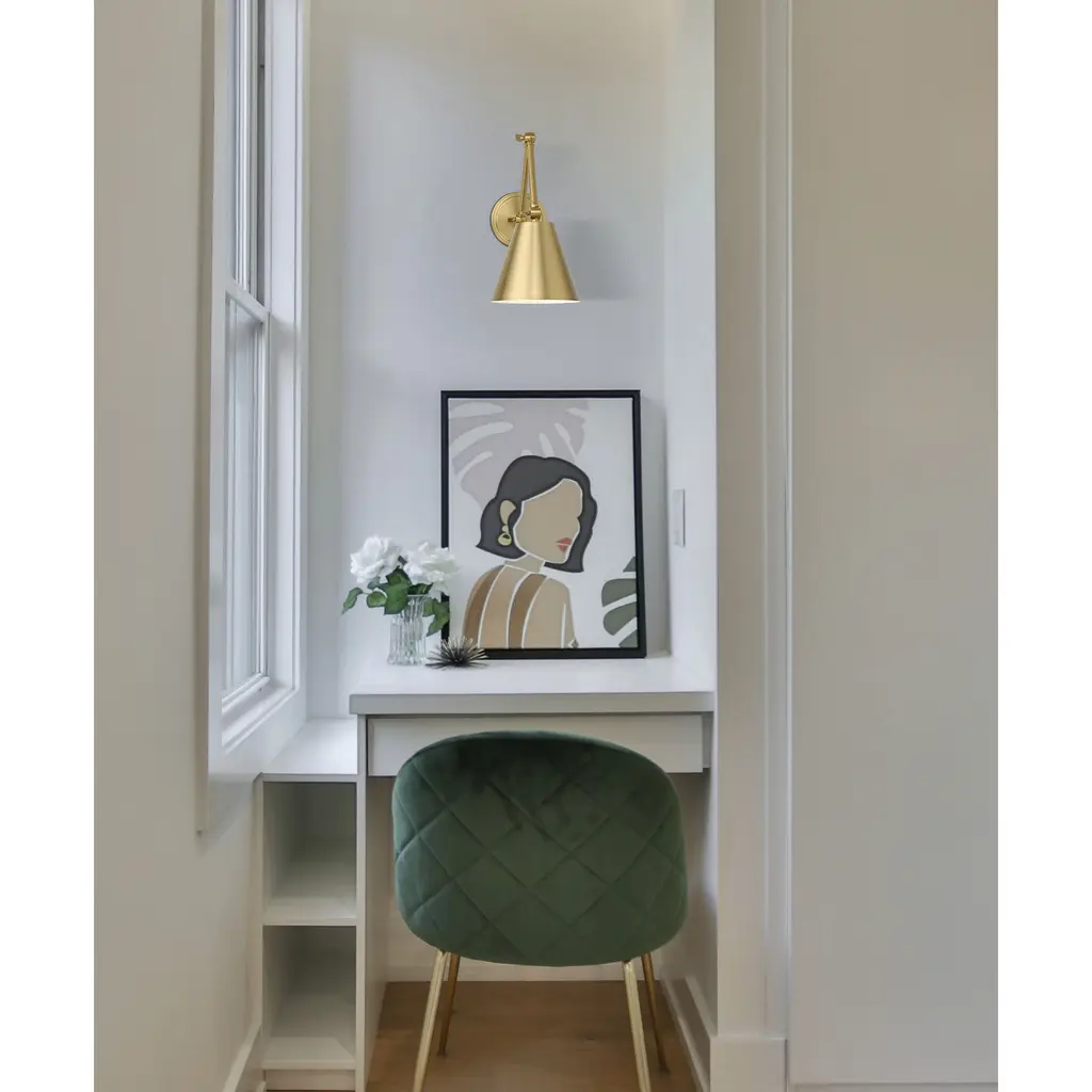 Gleaming modern gold finish metal brightens the studio-inspired design of a classic one-light wall sconce. Steel construction is true to its functional aesthetic, making the most of a wall-mounted light offering adjustable positioning of a cone shade. This fixture makes an excellent light for reading and task-mastering, as well as mood lighting ideal for a low-key setting.