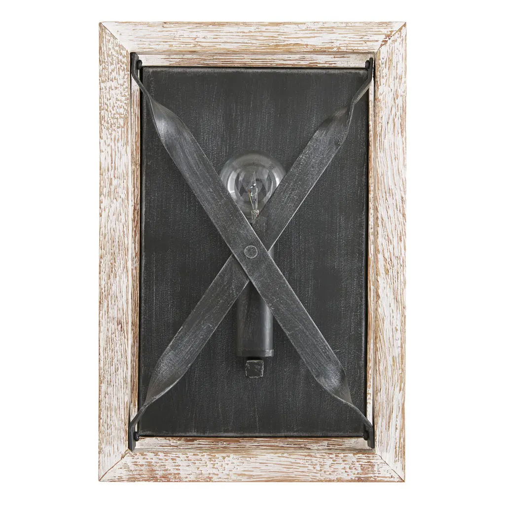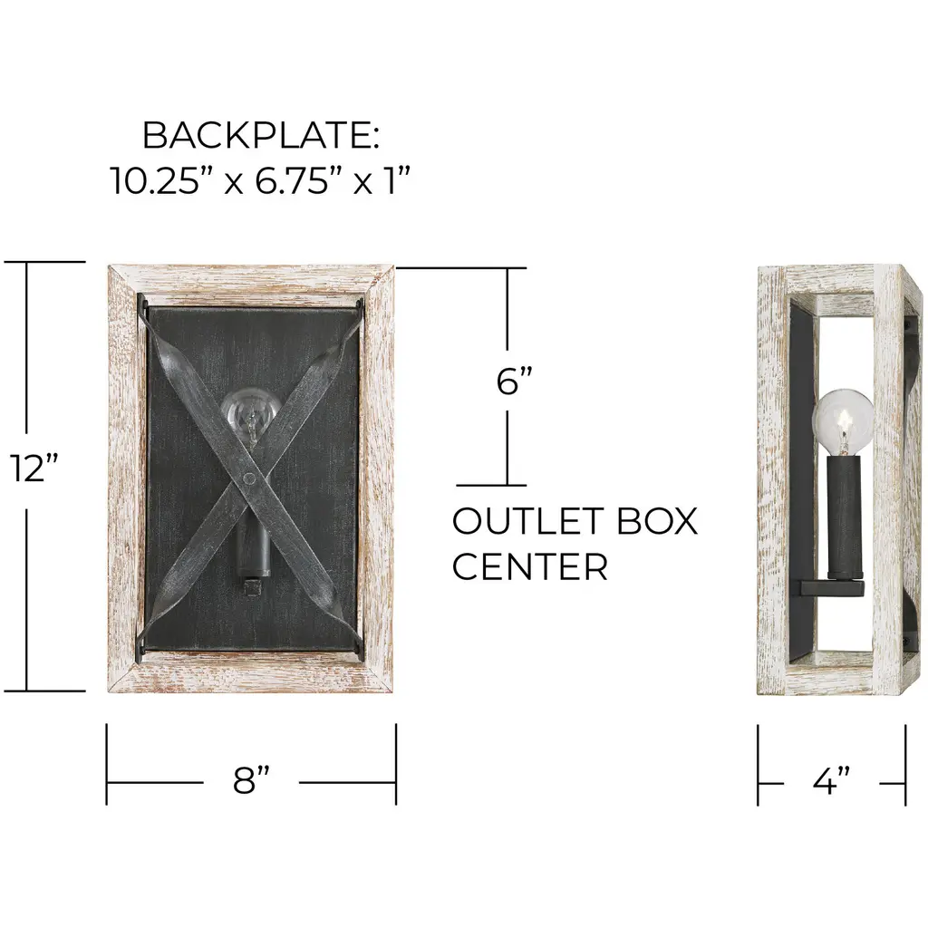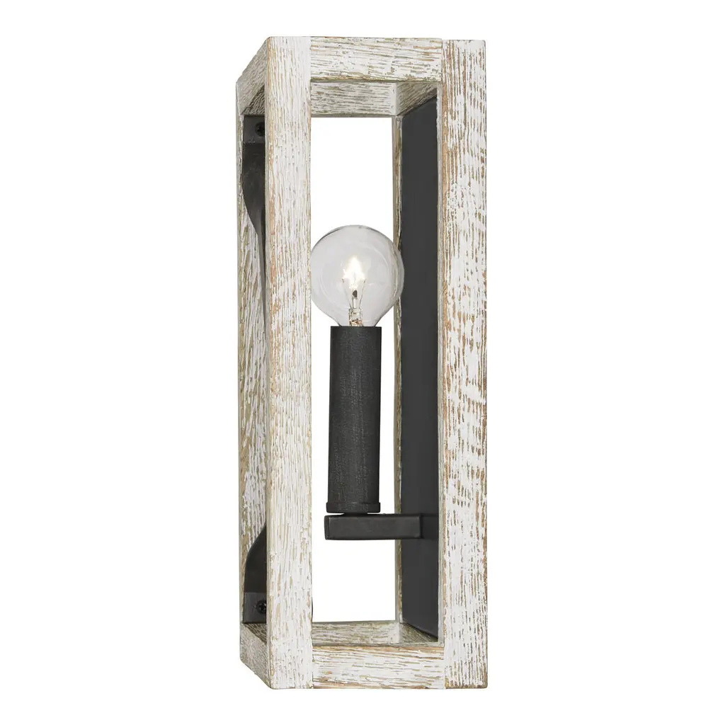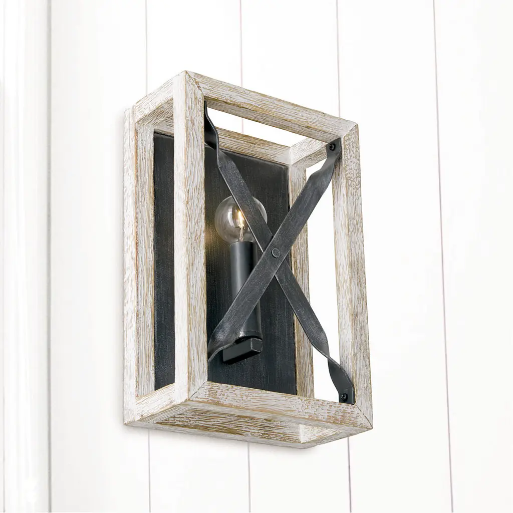 The juxtaposition of dark, visually distressed metal against white-washed, textured wood in the 1-Light Sconce brings a crisp freshness to the farmhouse trend.