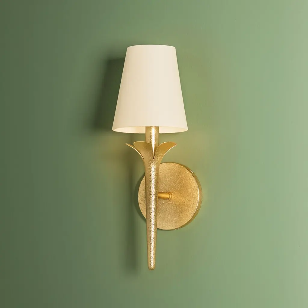 Slender arms with pretty petal-like accents bring a warm, floral feeling to this sculptural design. Tapered linen shades pair perfectly with the natural, organic vibe. Both the one-light sconce and the five-light chandelier will add a soft glow and a fresh style to any space.
