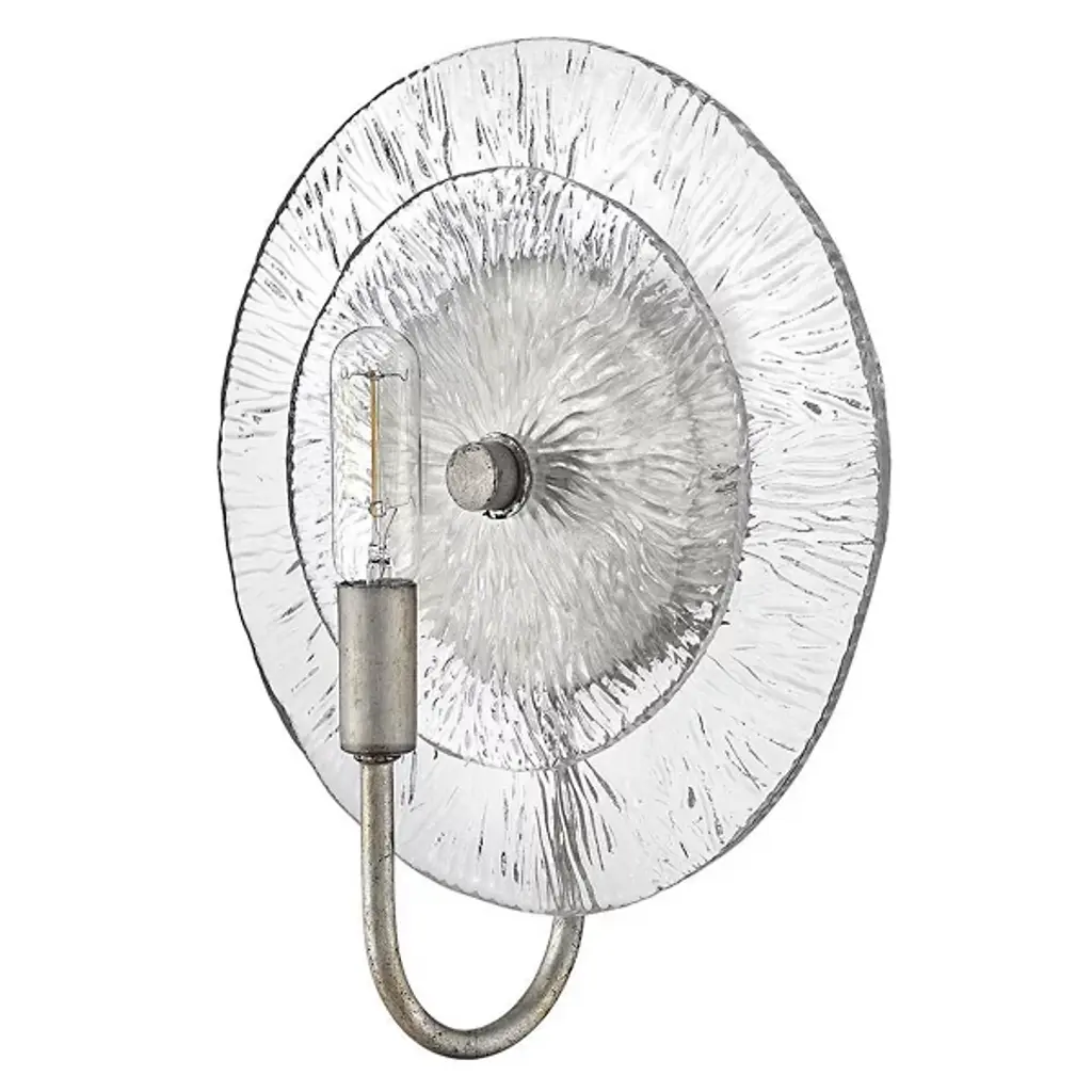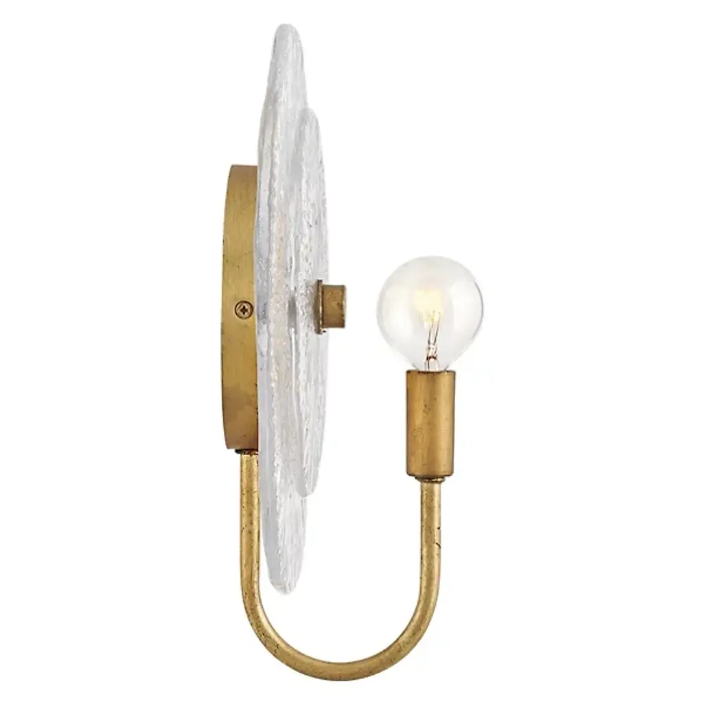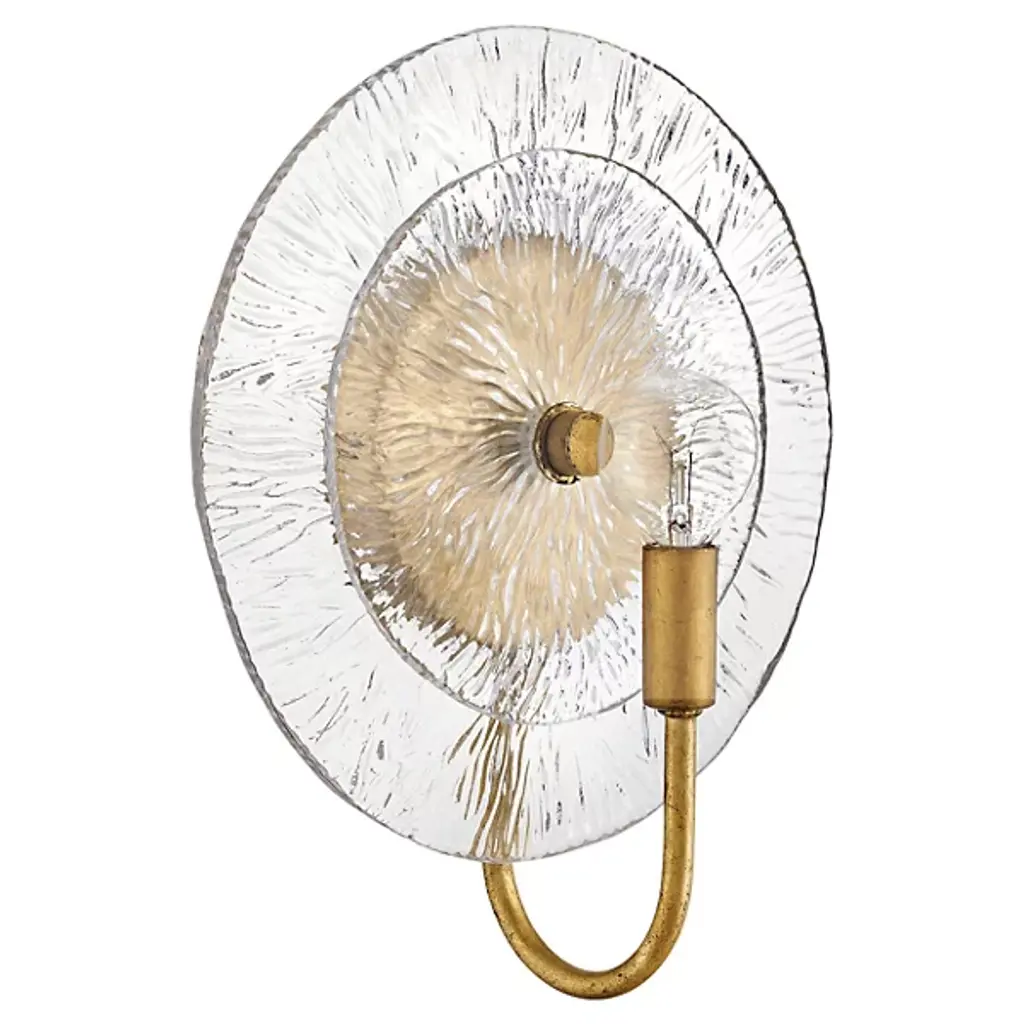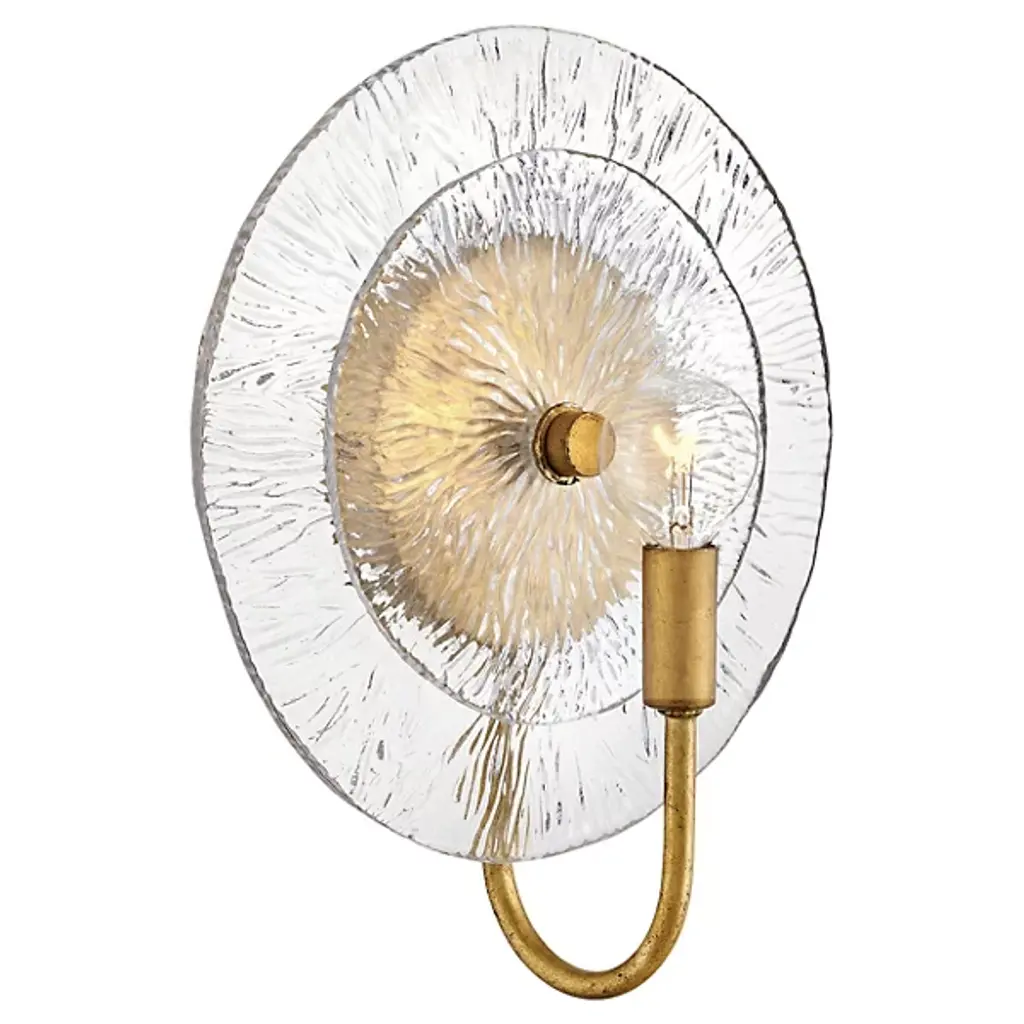 Give your home an Art Deco sensibility with the Rene Wall Sconce by Fredrick Ramond. Secured by a canopy at your ceiling, this fixture radiates light through multiple layers of beautiful, pressed glass disks. Rene's signature touch highlights a fine metal framework, evoking both transitional and glam influences. The Rene Wall Sconce is defined by its disc-shaped shade.