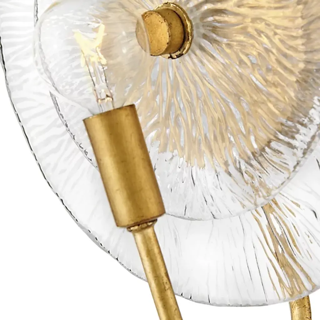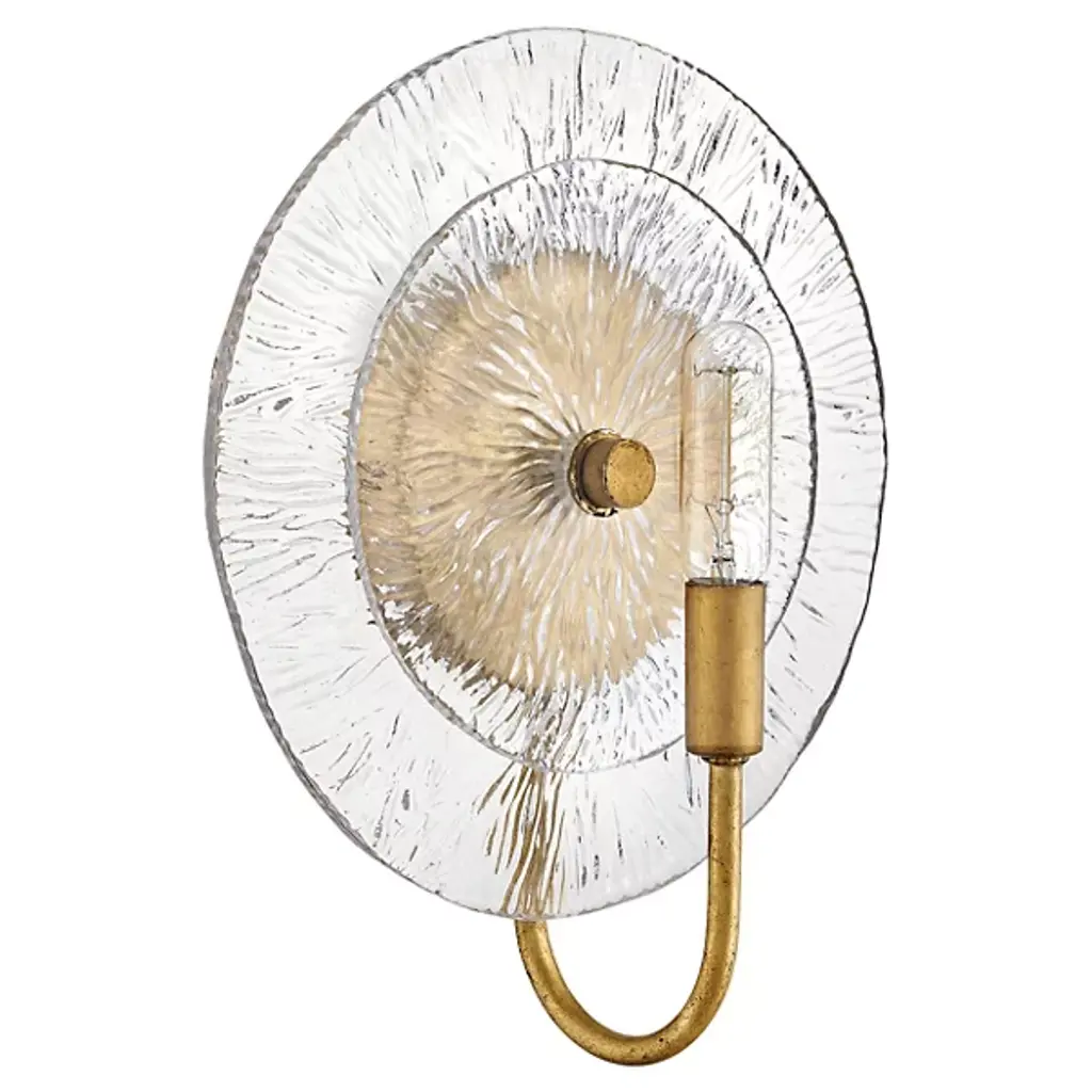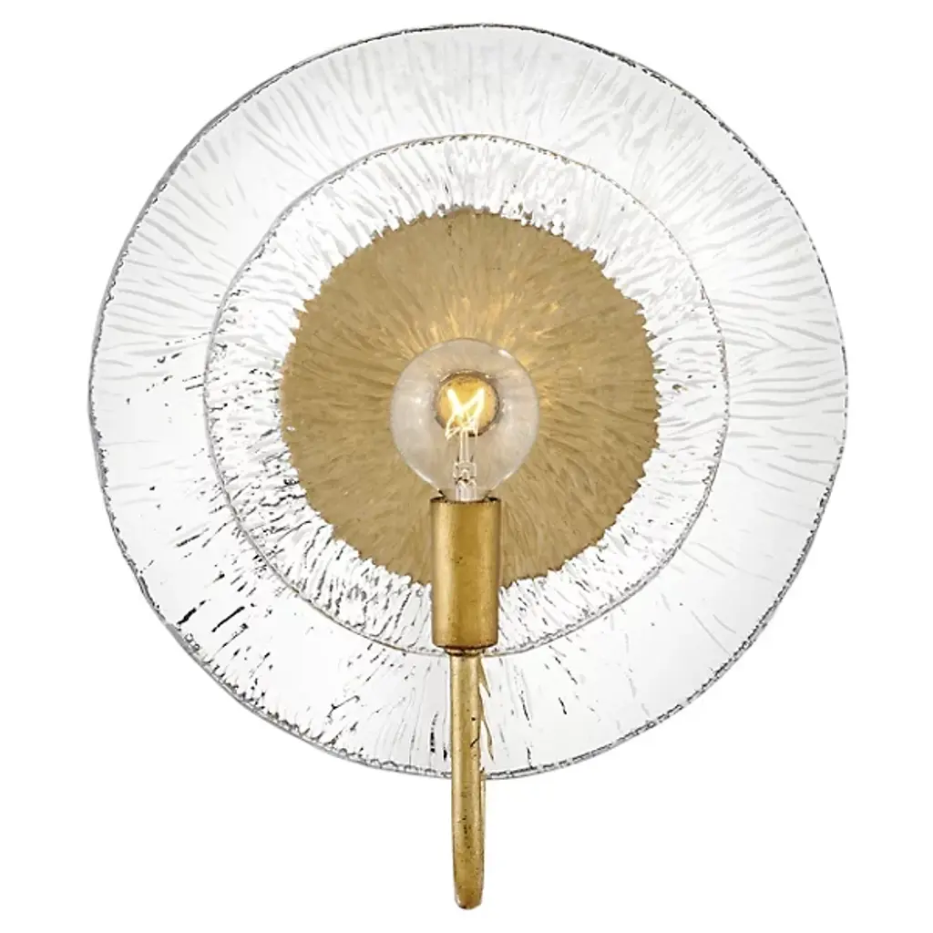 Give your home an Art Deco sensibility with the Rene Wall Sconce by Fredrick Ramond. Secured by a canopy at your ceiling, this fixture radiates light through multiple layers of beautiful, pressed glass disks. Rene's signature touch highlights a fine metal framework, evoking both transitional and glam influences. The Rene Wall Sconce is defined by its disc-shaped shade.