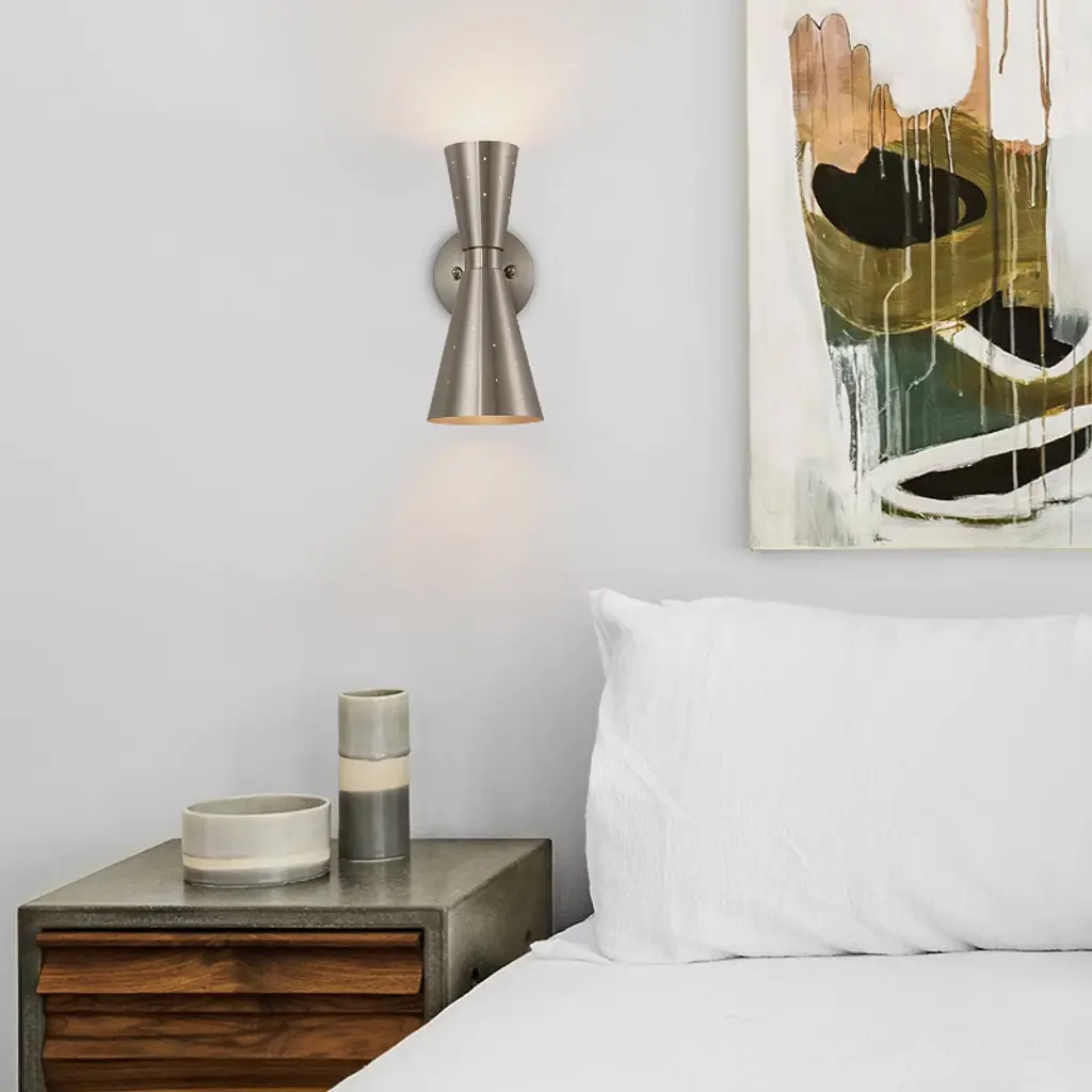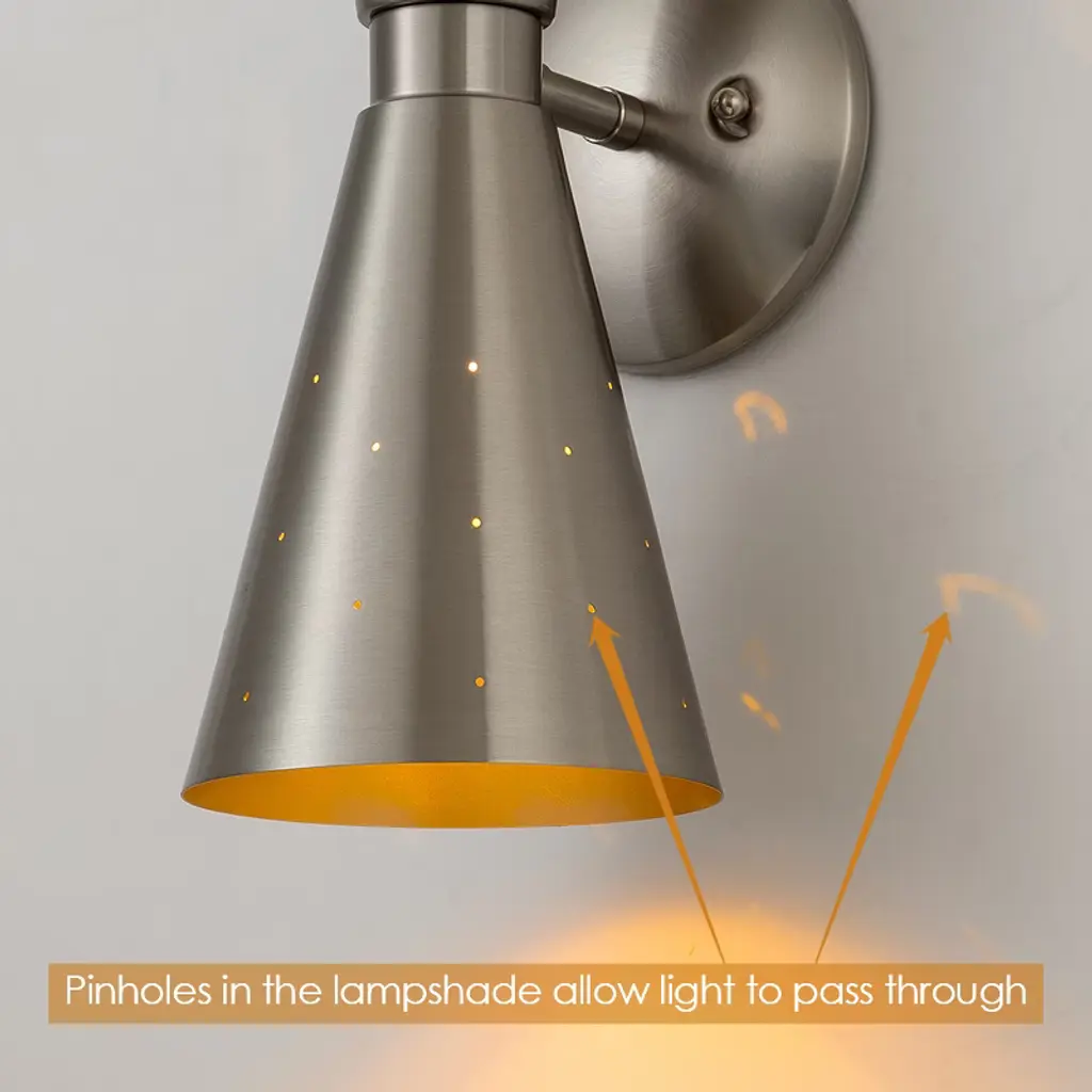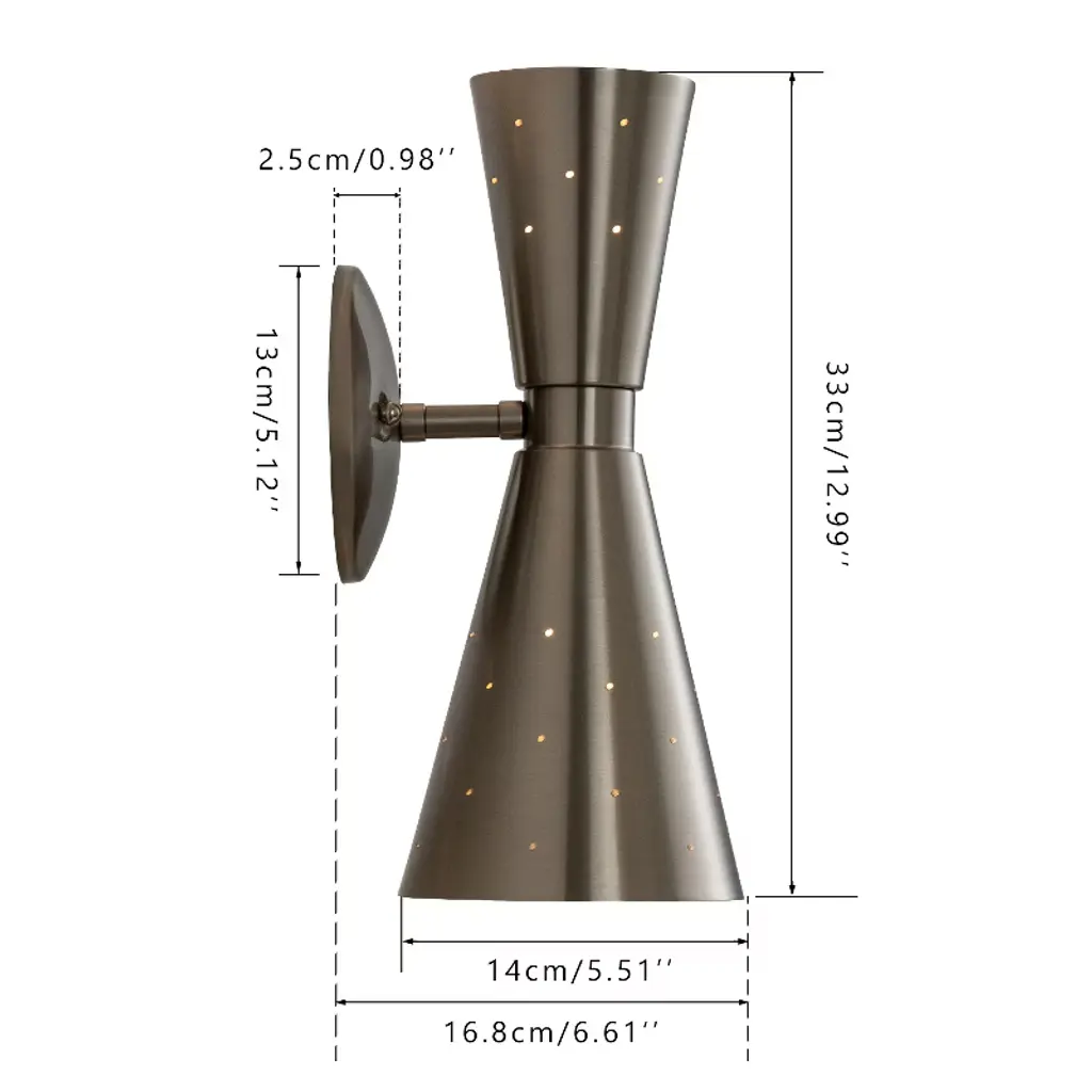 Add a stylish touch to your space with this 13" modern wall sconce, featuring a unique asymmetrical hourglass silhouette and pinhole perforations that not only enhance the aesthetic with light leakage but also aid in heat dissipation. Perfect for bathrooms or bedrooms, this mid-century wall light uses E12 bulbs (not included) to highlight its striking design. Available in brass and black finishes, pair it with a medieval-style vanity mirror for a cohesive, sophisticated look.