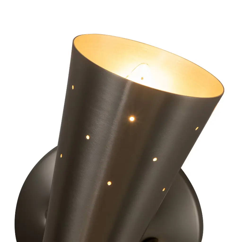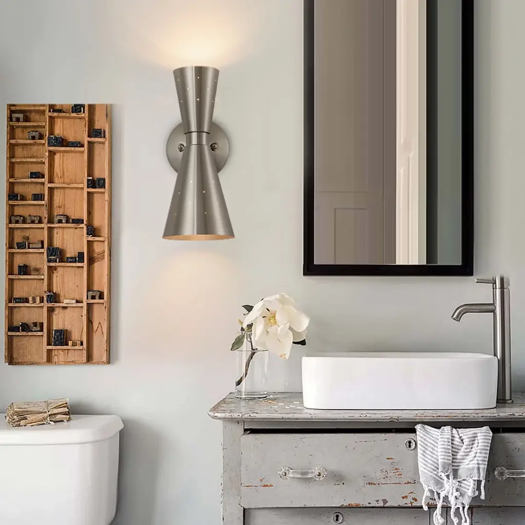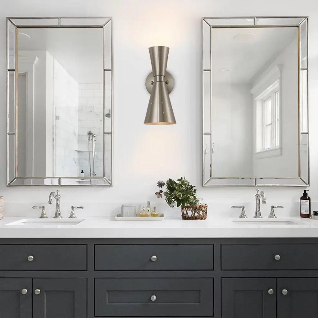 Add a stylish touch to your space with this 13" modern wall sconce, featuring a unique asymmetrical hourglass silhouette and pinhole perforations that not only enhance the aesthetic with light leakage but also aid in heat dissipation. Perfect for bathrooms or bedrooms, this mid-century wall light uses E12 bulbs (not included) to highlight its striking design. Available in brass and black finishes, pair it with a medieval-style vanity mirror for a cohesive, sophisticated look.