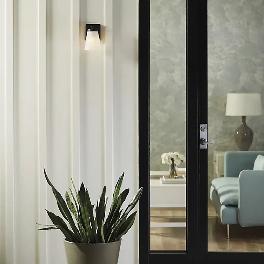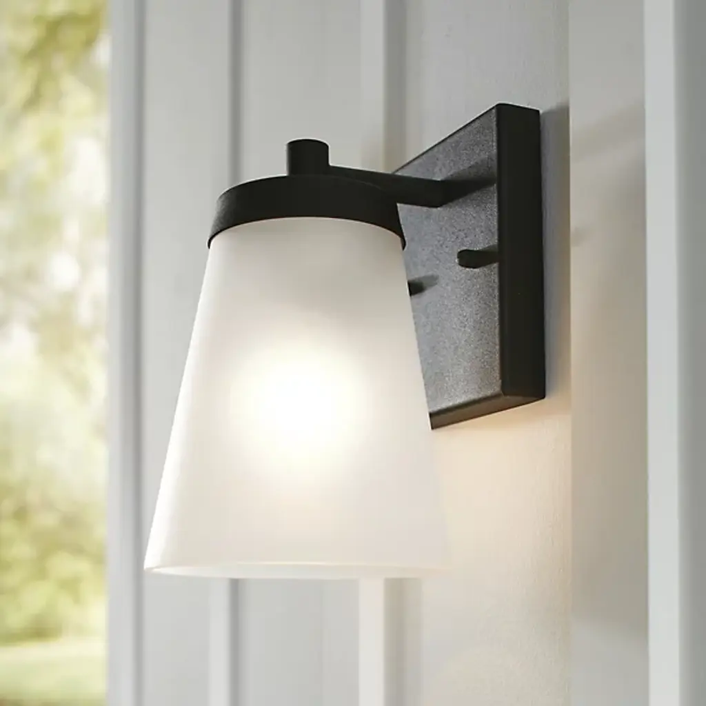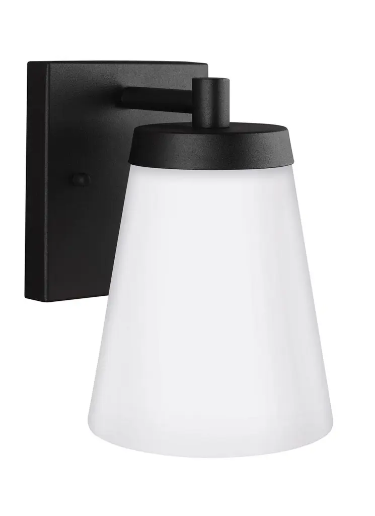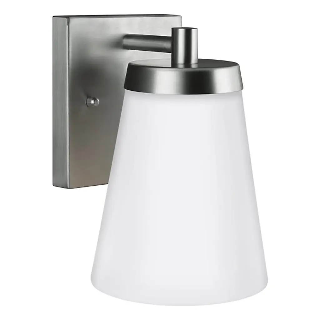 The Generation Lighting, formerly known as Sea Gull Lighting, Renville Outdoor Wall Sconce will accent your home with its simple design. A Satin Etched cone of glass diffuses light outward as it also directs light downward to its subject. Install in multiples to create symmetry.