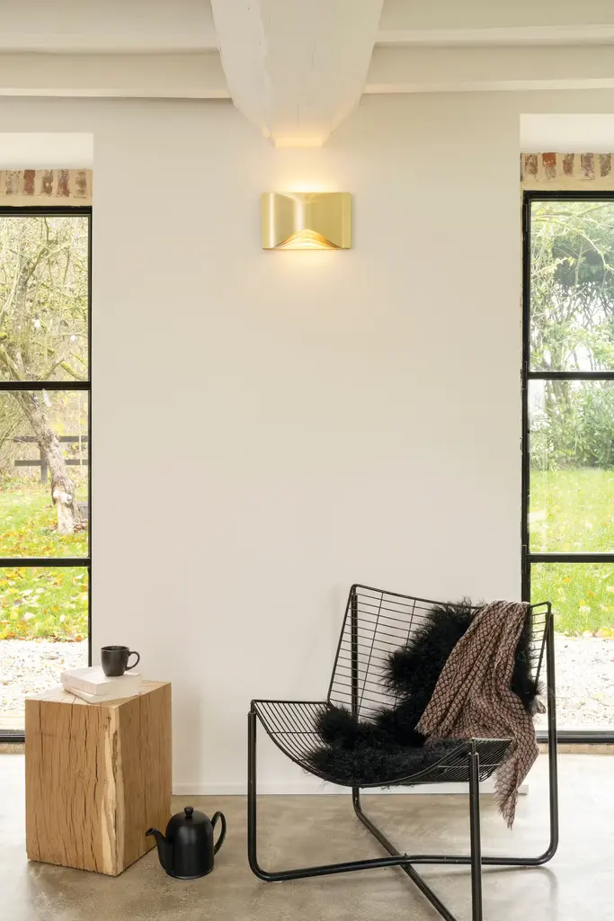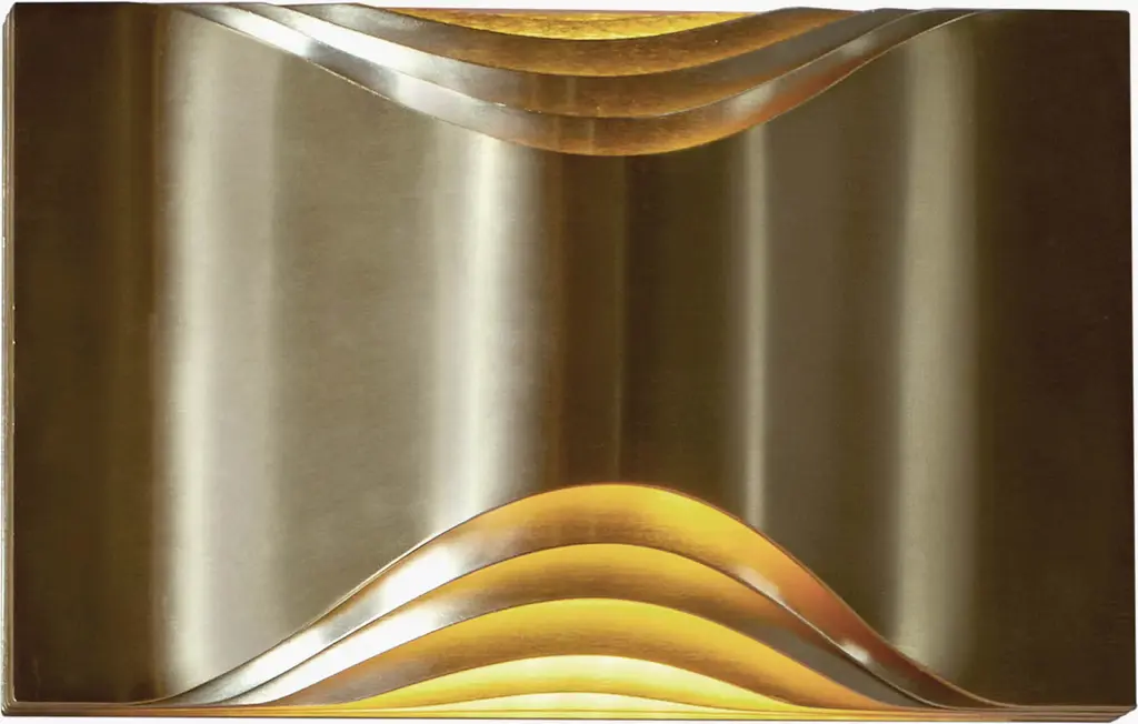 Tell the story of your space with a modern wall sconce that intrigues as well as illuminates. Crafted of gold-finished anodized aluminum, the Respiro Sconce (2019) is shaped with curved layers that suggest the pages of an open book. An integrated LED allows light to peek through the layers, which reflect and spread warm, ambient light above and below. Bulb (included): LED 14W 120V 2700K 85CRI. Made in China.