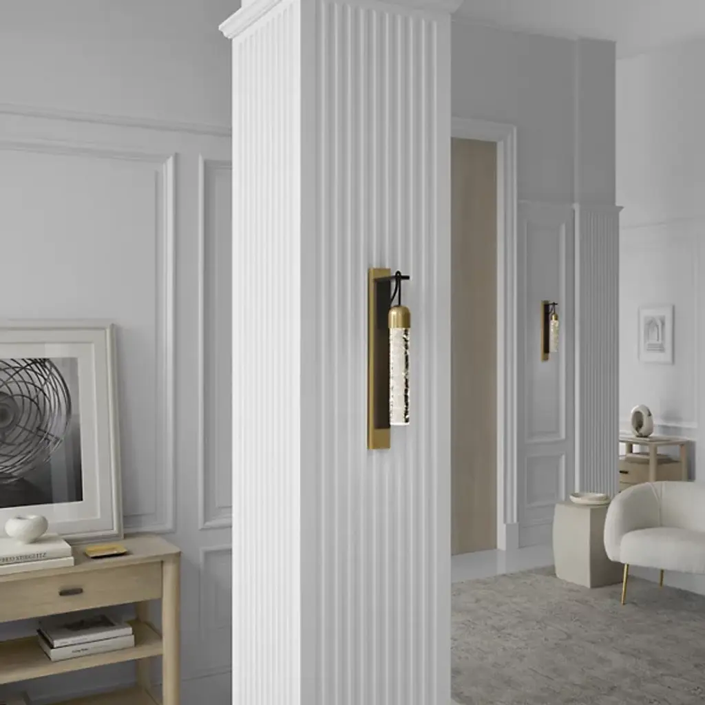 The Reve LED Tube Wall Sconce by Visual Comfort Signature, formerly known as Visual Comfort, is a tailored, elegant addition to spaces. Anchored by a sleek, layered, rectangular backplate that creates an arm that a practical cord is looped through, the hanging glass shade featured in this wall sconce is paired with a rounded metal cap. The textured quality of the cylindrical glass tube gives the light it filters a welcoming, playful quality that both brightens surroundings and highlights the neatly composed nature of this design.
