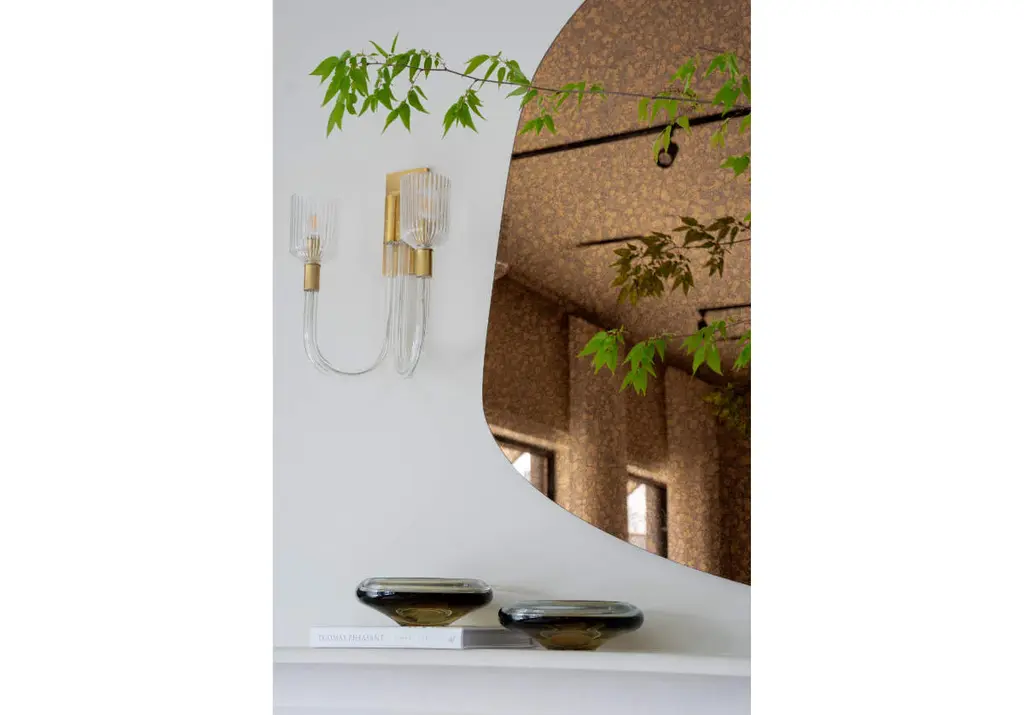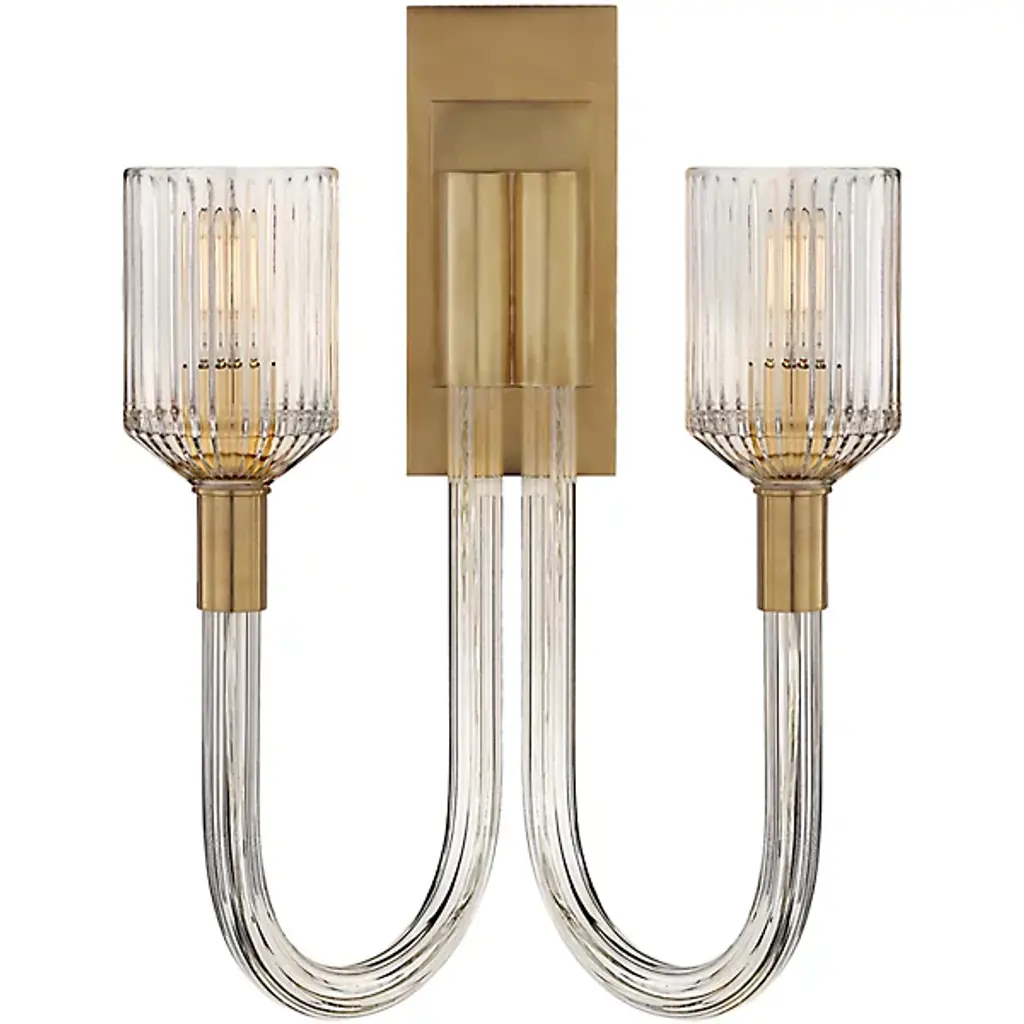Chic and sculptural, this sconce showcases artisanal ribbed glass complemented by curved arms and fluted glass shades. Its antiqued brass finish elevates its tasteful look, lending a classic, sophisticated touch. Style two above a mantle or in an entryway for an elegant design.