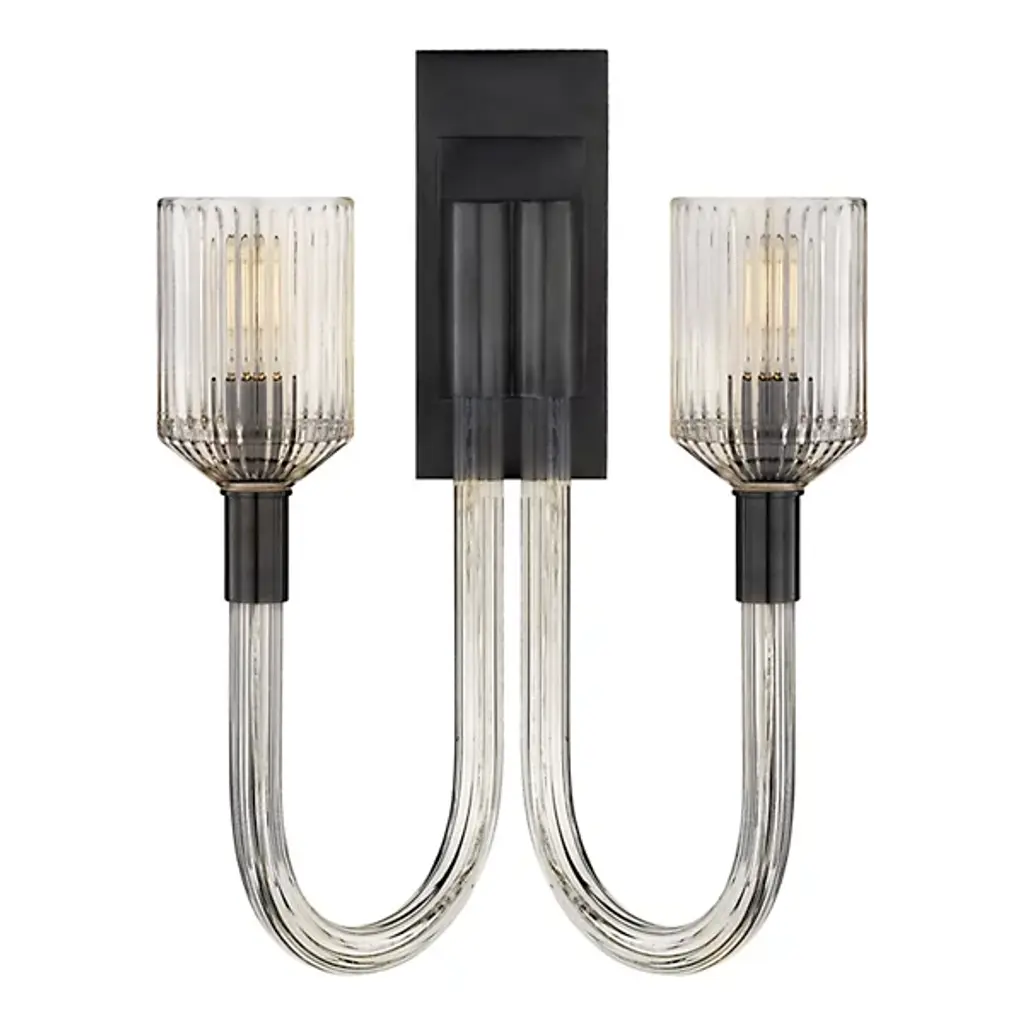 A dreamy light show with style to spare. The Reverie Double Wall Sconce from Visual Comfort Signature, formerly known as Visual Comfort, leads one’s gaze back and forth with an artful pairing of shimmering glass forms. The sconce creates a surge of visual interest, whether in between picture frames or across a hallway. Its graphic silhouette resonates in the modern or contemporary setting. It sports a compact backplate for versatile mounting. From it, a pair of ribbed glass arms sweep out in alluring curves. Accented by metal holders, cylindrical ribbed glass shades soften the image of the bulbs inside. The glass displays contours of highlights as ambient light beams through it.