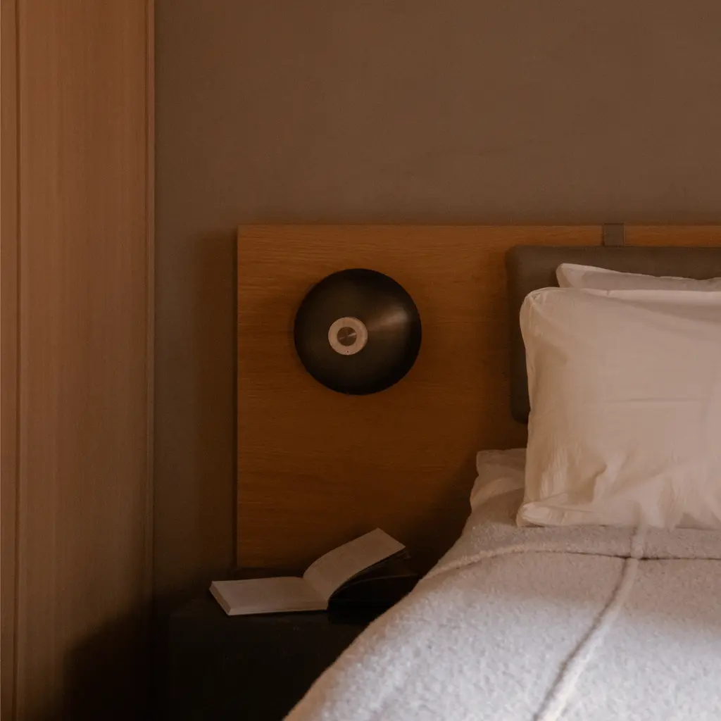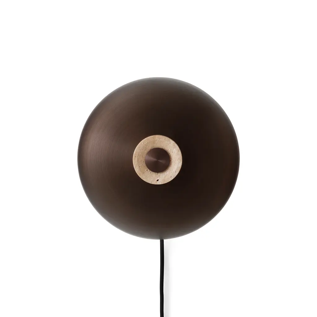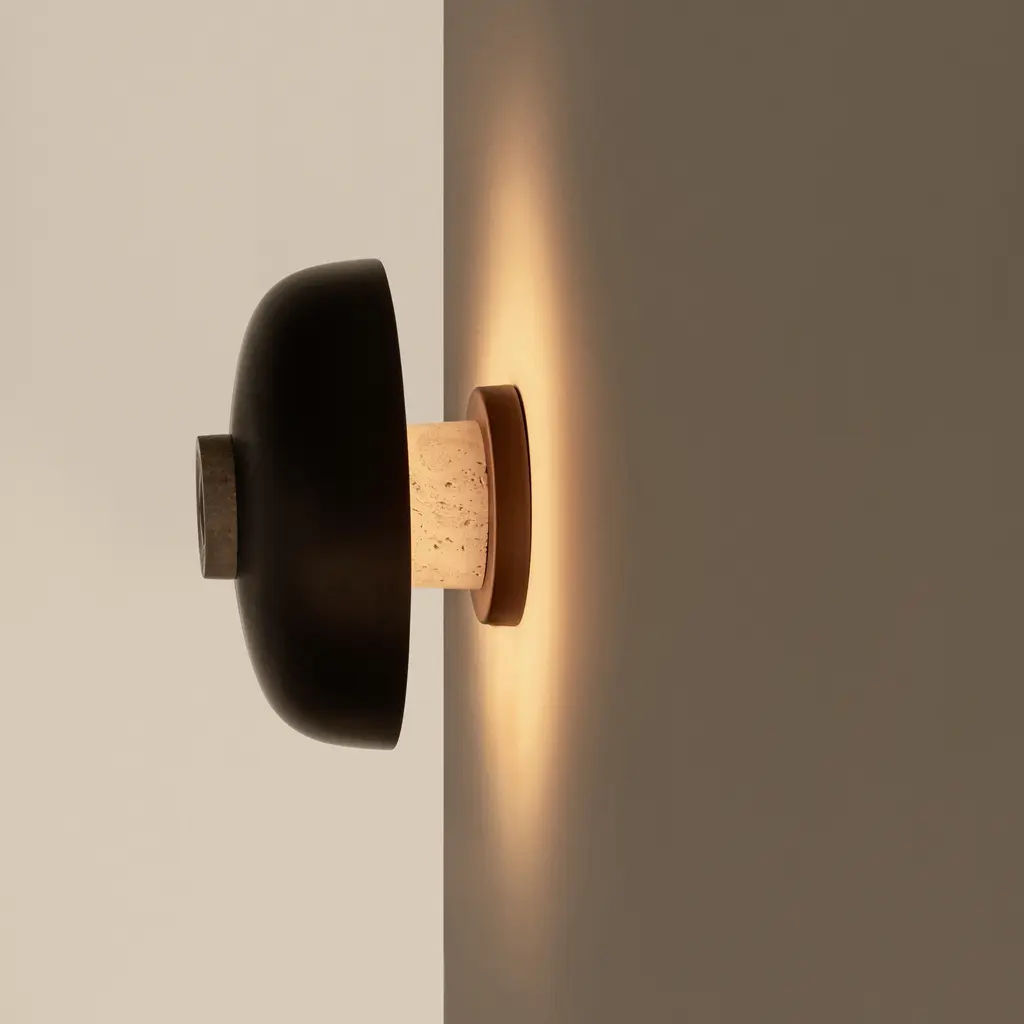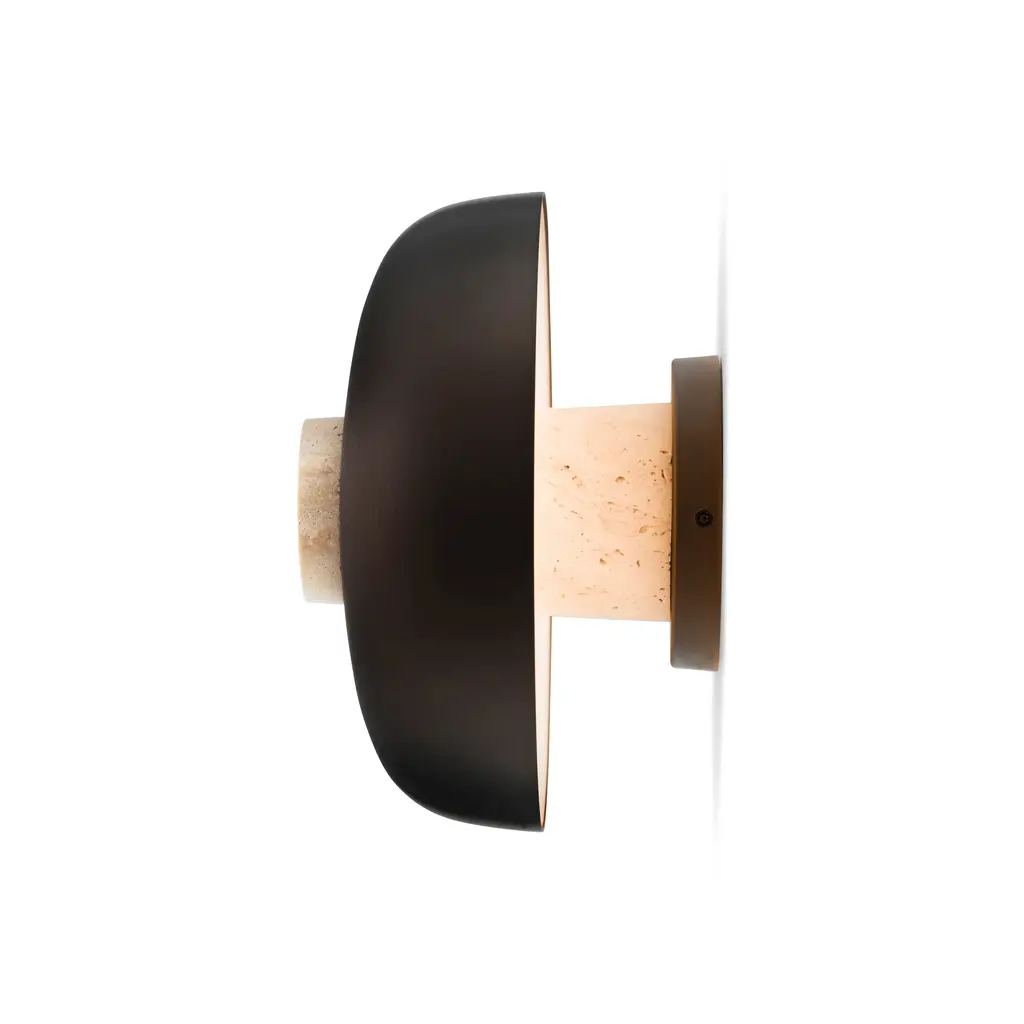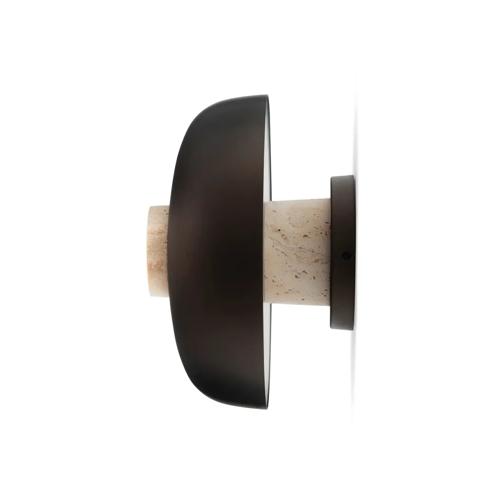 The Reverse Wall Lamp is inspired by both the tension and harmony created by geometric constraints. The lamp’s wall mount is crafted from untreated travertine stone, shaped into a conical form with natural imperfections that celebrate the beauty of organic textures. In contrast, the curved shade is made from anodised bronzed aluminium with a smooth finish for a polished touch. The lamp features an opal diffuser for even light diffusion and a warm, ambient glow. For retail use, the lamp features an intuitive dimmer, allowing seamless brightness control, with a switch-free cord for a clean aesthetic.The contract version is tailored for commercial spaces, with a rotary dimmer on the cord for easy access and a decorative, non-functional top button. It too supports hardwired installation, ideal for hotels, offices and public spaces. Both versions can be hardwired for a more seamless installation. Features