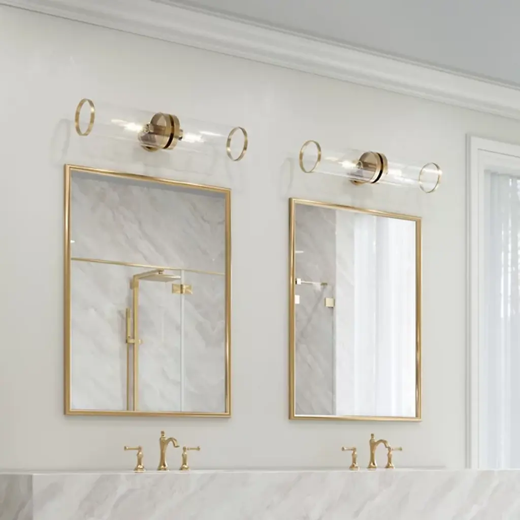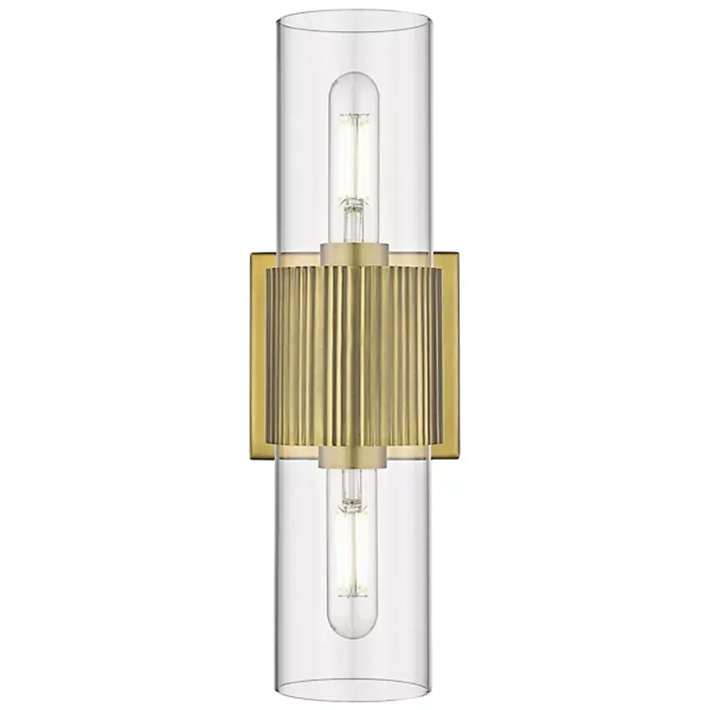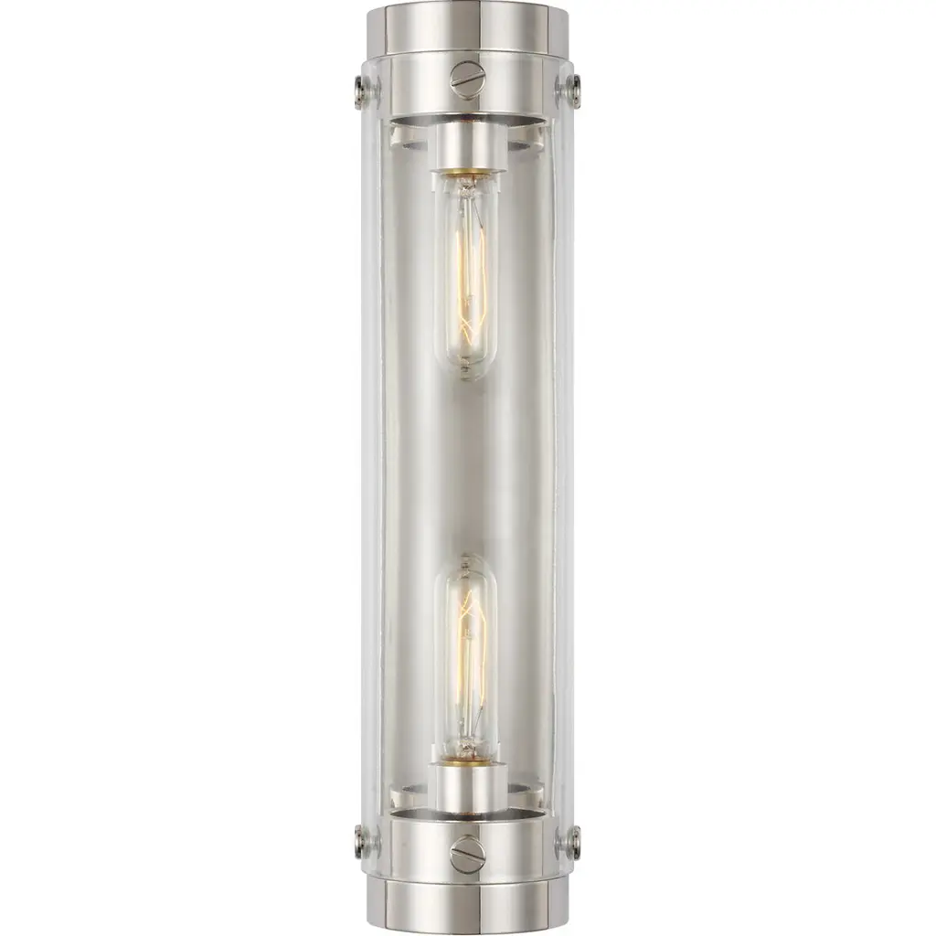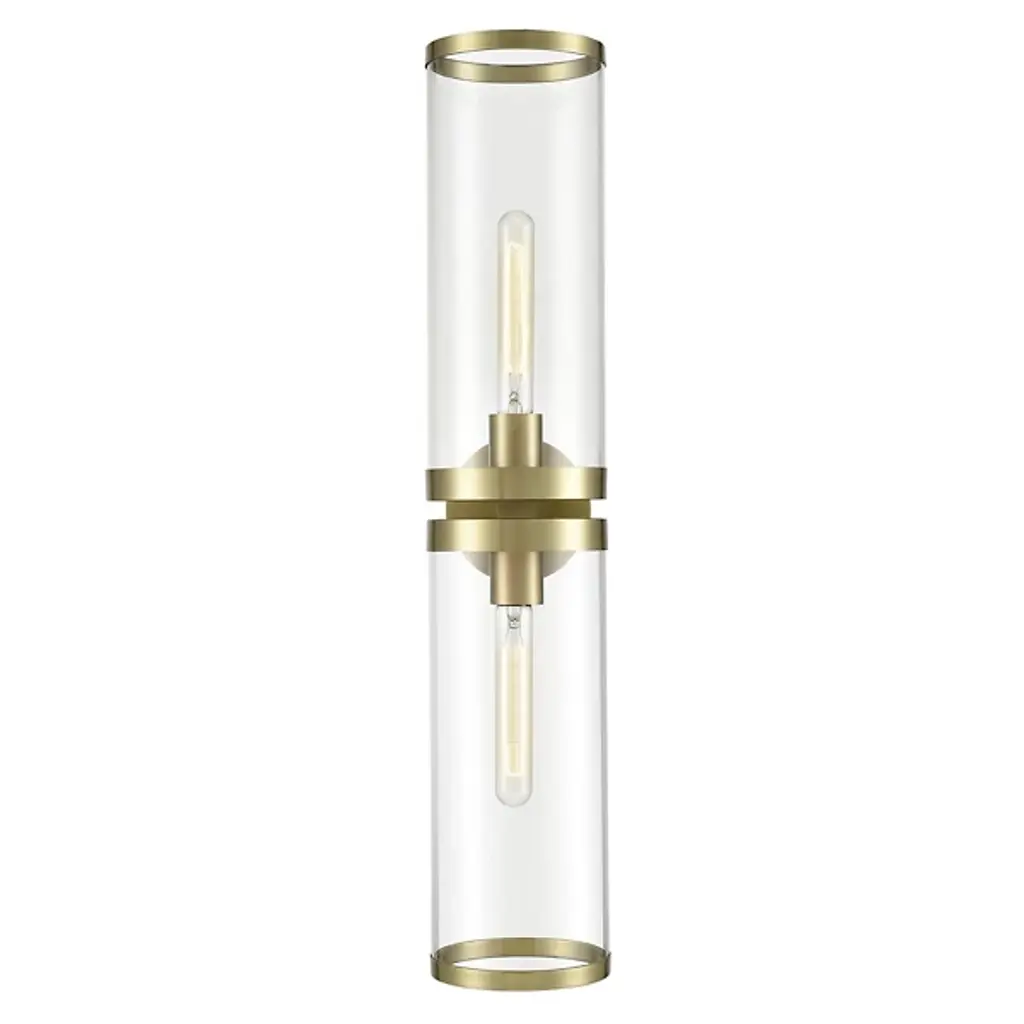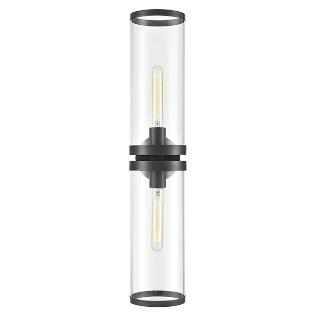 Class up your interior walls with a column of light from the Revolve II Double Wall Sconce from Alora Lighting. Anchored to the wall by a smooth disc wall mount, it holds two damp-rated candelabra-style sockets in direct opposition to each other, one oriented upwards, and the other towards the floor. Each lamp is screened by an oversized cylindrical shade fashioned from clear glass and topped with a flat-sided metal ring that ties it into the rest of the framework.